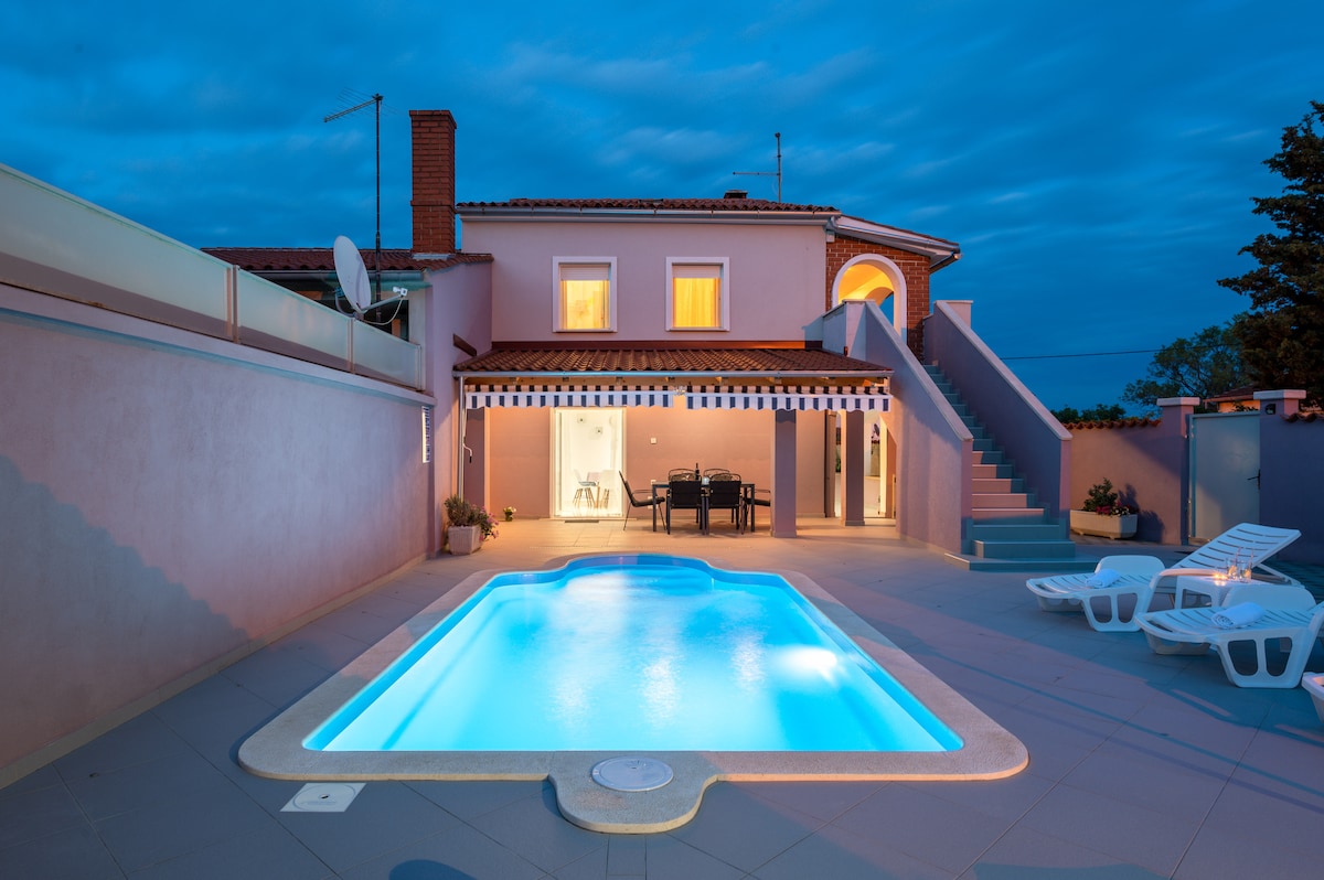 Tumataas ang elegante at maluwag na villa sa itaas ng distrito ng Rovinj, Borik. Dalawang palapag na awtentikong bahay sa isang pribadong lugar na may sariling swimming pool. Ang villa ay may 6 na silid - tulugan na may malalaking double bed, 2 sala na may mga fireplace, kusina at sofa. May sariling banyo at 2 pang banyo sa mga sala ang bawat kuwarto. May magagamit na terrace ang bawat kuwarto na may mga nakamamanghang tanawin ng dagat. Nakatayo ang Villa sa isang burol at napapalibutan ng mga halaman.