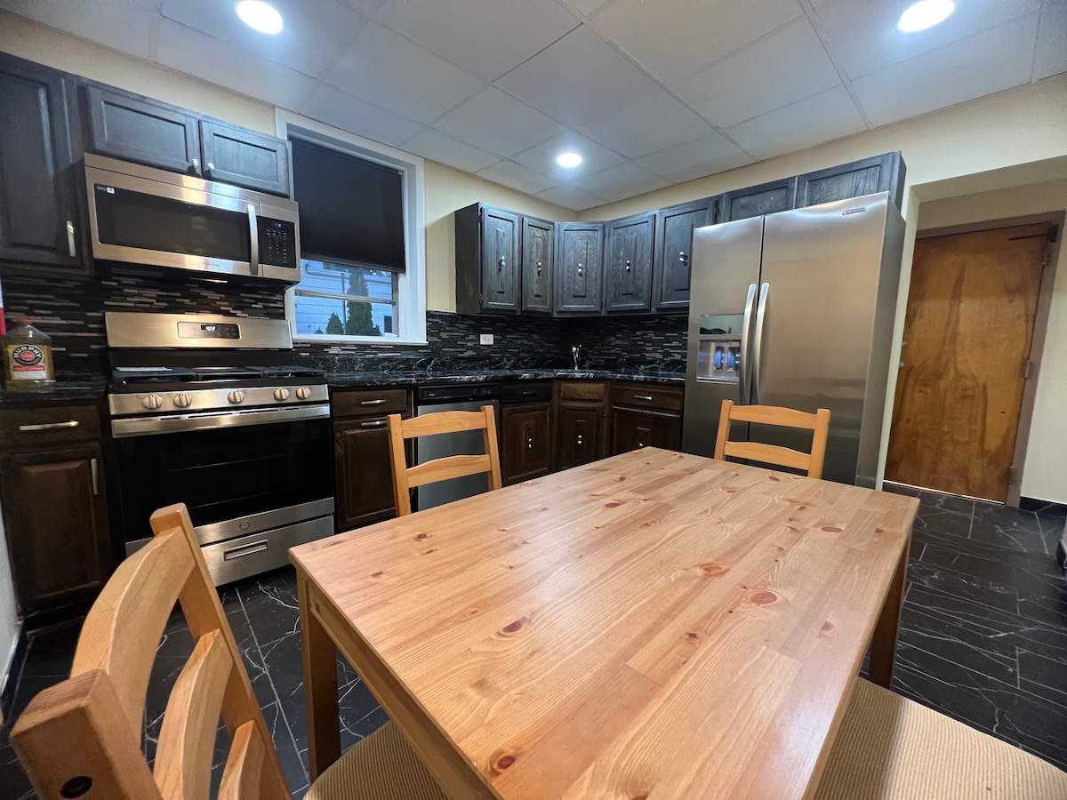 Perpekto ang naka - istilong lugar na ito para sa mga biyahe ng pamilya o grupo. Madaling mapupuntahan ang Newark Liberty Airport, Met Life Stadium, NYC, at marami pang iba. Matatagpuan sa tabi ng maliit at maayos na parke ng lungsod. 15 minuto mula sa paliparan, may sapat na paradahan sa kalye sa harap mismo. Ang pinakamalapit na hintuan ng bus ay sa 18th Ave at Eastern Parkway / 18th Ave at Western Parkway at wala pang 5 minutong lakad ang layo mula sa bahay. Ang 107 express bus papuntang Manhattan Port Authority ay tumatakbo kada oras sa mga araw ng linggo at tumatagal ng 35 minuto papunta sa lungsod.
