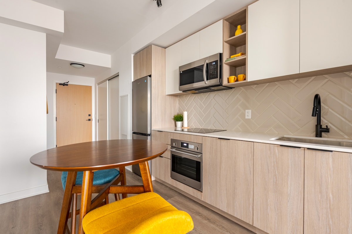 Nag - aalok ang one - bedroom, two - bathroom suite na ito sa ika -40 palapag ng humigit - kumulang 750 talampakang kuwadrado ng open - concept living. Nagtatampok ang maliwanag at maluwag na layout ng mga de - kalidad na finish, kabilang ang mga granite countertop, stainless steel na kasangkapan, at mga bintanang mula sahig hanggang kisame. Ang lahat ng mga kasangkapan ay may kalidad na taga - disenyo, na lumilikha ng isang naka - istilong moderno at komportableng kapaligiran. Nakakadagdag sa pangkalahatang karanasan ang mga ilaw sa skyline at lungsod. Kasama sa suite ang King - size bed, work desk, washer/dryer, at maraming espasyo!