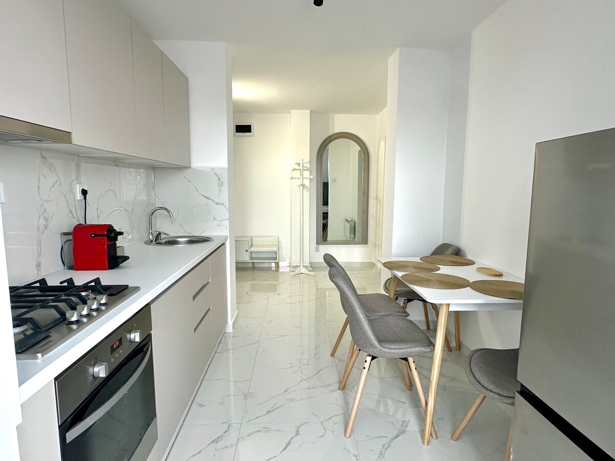 Mag‑enjoy sa natatanging karanasan sa moderno, pamilyar, at tahimik na tuluyan na ito na nasa sentro ng bayan. Kasabay nito, 3 minuto ito mula sa Ocna Mures Salt Baths. Ang lugar ay may 41sqm, na binubuo ng banyo, pasilyo, silid, kusina. Wifi, tv, aircon, refrigerator, hob, oven, king size na higaan.