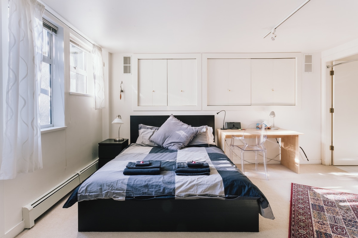 Perfect Location! Near beach, Parking & quiet private suite and small garden. Walk down the hill to a quiet calm beach or walk 5/10 minutes to lively Kits beach and Yew St coffee shops, restaurants, take out and Street cafes. 10 minute walk to W. 4th Ave with Italian, French, Mexican, Middle Eastern restaurants, retail stores, groceries & pubs/bars. Downtown, UBC 15- 20 minutes by bus! The bus is 1 block away and (cleaning with antibacterial/disinfectants for your safety.) One largish room.