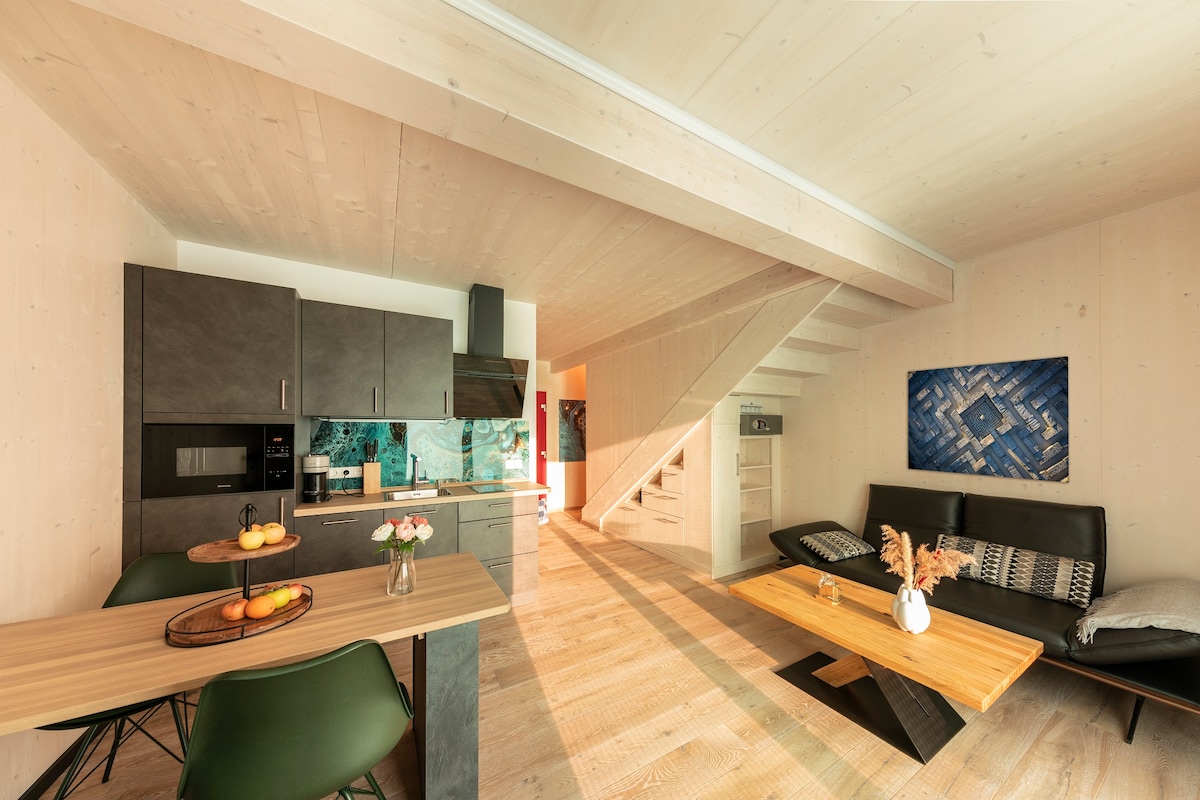 16 sqm coziness sa friendly furnished bungalow para sa 2 tao. Tahimik na lokasyon na napapalibutan ng mga halaman, katabi ng kagubatan, parang at bukid! Nag - aalok ang maliit na kusina ng lahat ng kailangan mo, pati na rin ang lababo, refrigerator, double induction cooker, takure, coffee maker at toaster. Ang maaliwalas na double bed (160m x 200m) ay may dalawang dimmable bedside lamp at side shelves. Ang sapat na storage space ay ibinibigay ng dalawang estante, ang espasyo sa ilalim ng kama at maraming kawit sa pader.