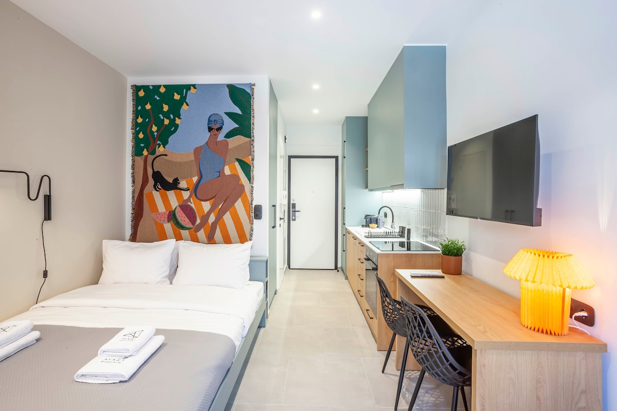 Natatanging magandang studio sa gitna ng lungsod. Lumabas ka sa pinto sa harap at mapupunta ka sa Aristotelous square, kung saan madali mong maaabot ang lahat ng kagandahan ng masiglang lungsod na ito! Maayos itong idinisenyo para maging elegante at komportable, at mayroon ding napakagandang patyo sa loob na kinalagyan ng mga pagpapaganda noong Mayo 2023! Ang optic fiber internet, na may hanggang 200Mbps na marangyang kutson, smart TV at kahit Nespresso machine ay ilan sa mga amenidad na ibinibigay! Welcome!
