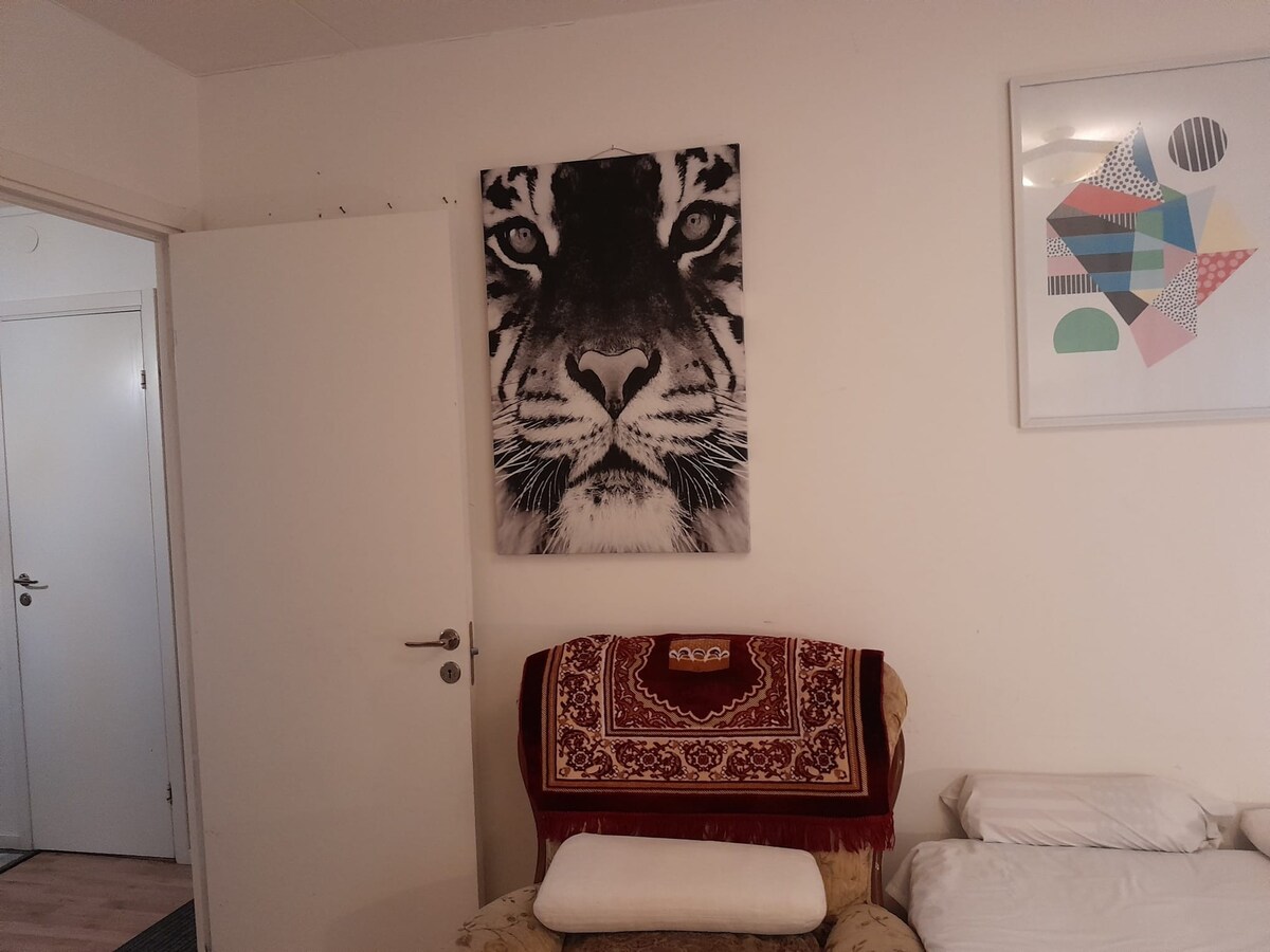 Ang apartment ay 120 sqm (1290sqf). Dalawang silid - tulugan at isang malaking sala na may kasamang kusina. May dalawang apartment sa bahay. Nasa ibabang palapag ang apartment na ito. Ang dalawa ay ginagamit bilang mga apartment ng AirBnB. Paghiwalayin ang mga pasukan. Parehong may sariling kusina na may lahat ng kinakailangan tulad ng coffee machine, waterboiler, refrigerator at dishwasher. Banyo na may shower at toilet. Nasa labahan ang washing machine, dryer, at flatiron. Hi speed Wifi at TV na may ilang mga channel. Itinayo 2015.
