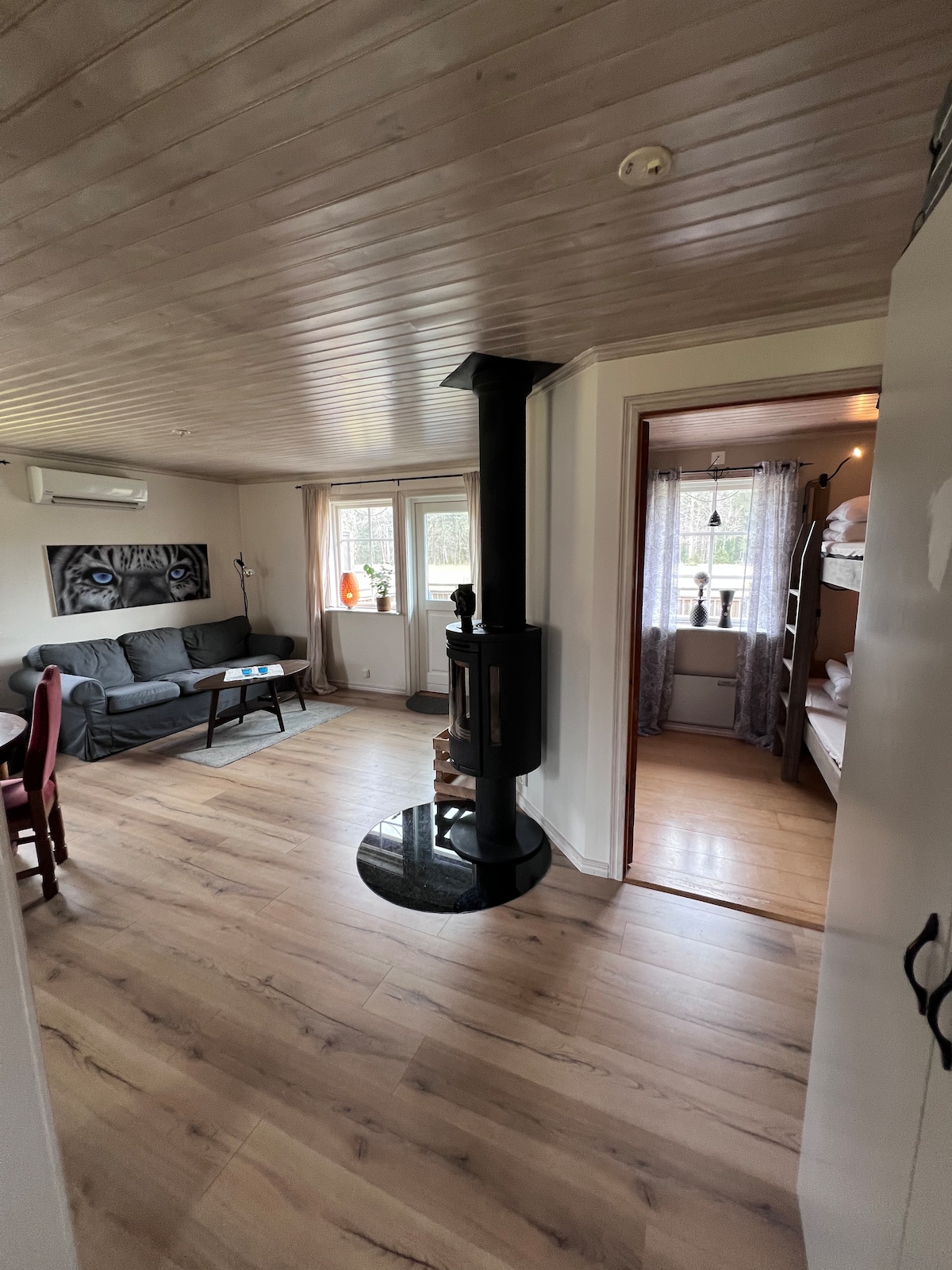 Cottage na may property sa lawa at sarili nitong beach at pantalan. 3 silid - tulugan, 1 kuwartong may double bed, 2 kuwarto bawat isa ay may bunk bed, pati na rin sofa bed para sa 2 tao sa TV room. Shower at toilet na may sariling balon at pampainit ng tubig. Tandaan, walang washing machine. Magdadala ang bisita ng kanilang sariling mga linen at tuwalya. Access sa mainit na paliguan (39 degrees) sa buong taon na may sirkulasyon para sa paglilinis. May kasamang rowing boat. Magdala ng sarili mong life jacket. Walang usok at walang alagang hayop ang cabin! Pansinin, hindi para sa mga grupo ng pakikisalu - salo!