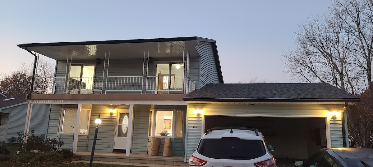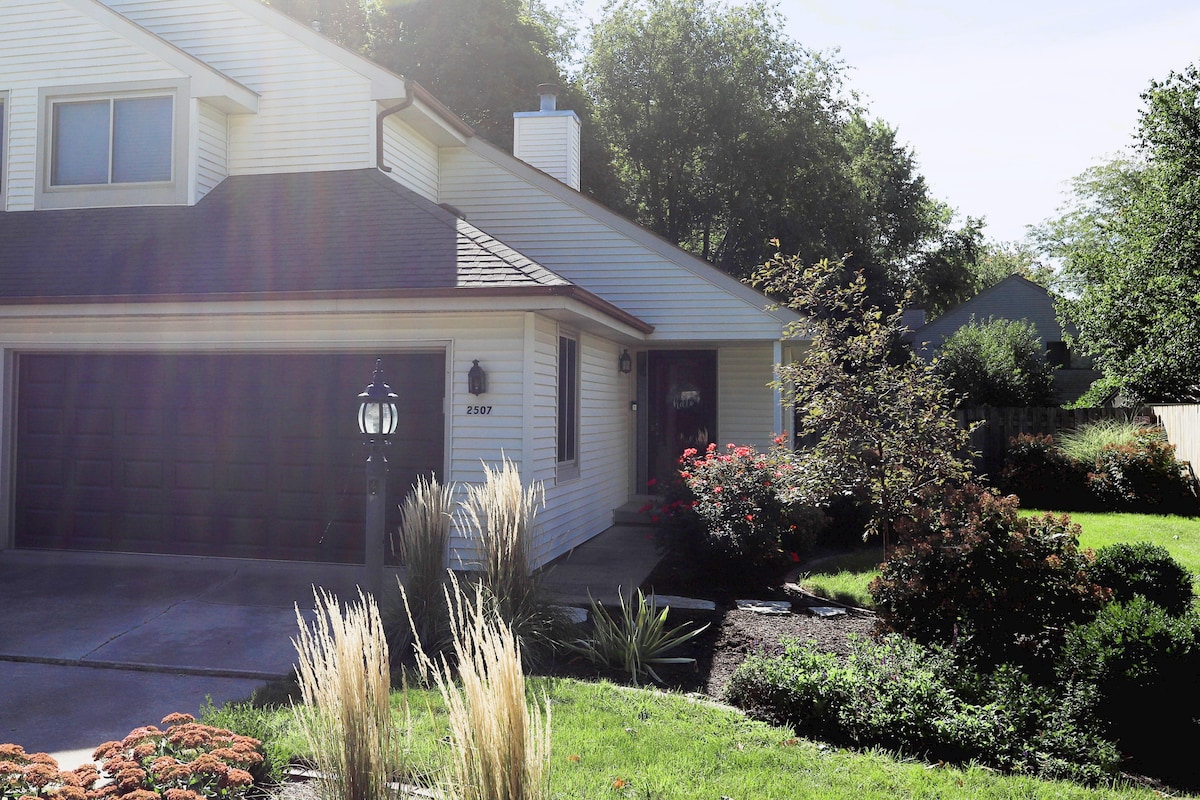 Matatagpuan ang aming Tuluyan sa isang tahimik na cul - de - sac sa kanlurang Urbana ilang minuto lang ang layo mula sa U of I campus/stadium, State Farm Center, at mga ospital; pati na rin sa golf course/range ng pagmamaneho, mga restawran, at shopping. Nasa tuluyang ito ang lahat ng kakailanganin mo para sa komportableng pamamalagi; para man ito sa isang mahabang katapusan ng linggo o isang buwan na pamamalagi. May king bed sa master at queen bed sa guest room na may mga dagdag na unan/kumot at may sapat na stock ang mga banyo.