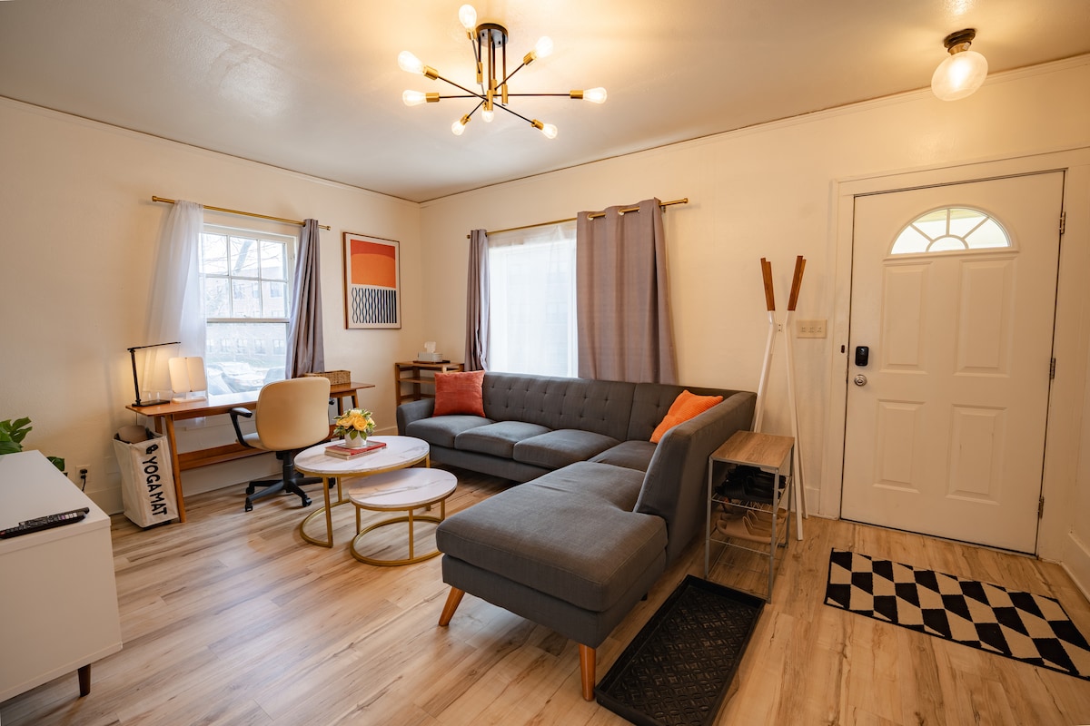 Tuklasin ang modernong kaginhawaan sa magandang inayos na 2 - bedroom retreat na ito sa Urbana, IL. Idinisenyo para sa kaginhawaan at estilo, nagtatampok ang minimalist na tuluyan na ito ng masaganang sectional, malaking smart TV, at kusinang kumpleto sa kagamitan na may makinis na itim na granite counter. Gumising sa natural na liwanag sa mga komportableng silid - tulugan, humigop ng sariwang kape sa tahimik na setting, at mag - enjoy sa banyong tulad ng spa na idinisenyo para makapagpahinga. Bumibisita ka man para sa trabaho, paglilibang, o tahimik na pagmuni - muni, nilagyan ang Escape para matugunan ang iyong mga pangangailangan.