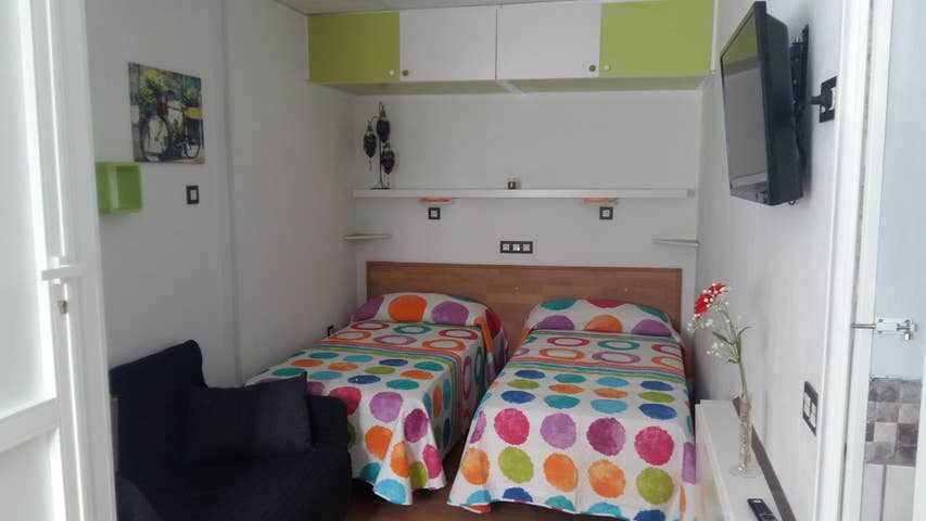 Nag - aalok kami ng apartment na 40m2 ng kapaki - pakinabang na lugar sa tabi ng Historic Center ng La Laguna, sa Plaza de San Benito, kung saan matatagpuan ang simbahan na idineklarang Cultural Interest Property (B.I.C.). Ang apartment ay may isang double bedroom na may dalawang twin bed at built in na wardrobe. Banyo na may shower, toilet, at lababo. Isang sala - kusina na may lahat ng kinakailangang kagamitan: microwave, blender, malaking mesa para sa pagkain o pagtatrabaho, armchair - bed para sa dalawang tao, smart tv at wifi.