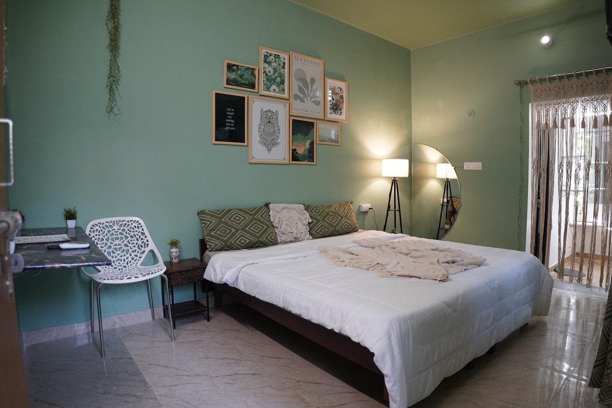 ♂ Part of a sprawling bungalow, surrounded by greenery, this peaceful 1BHK Studio is situated on the 1st Floor. The bohemian vibes with lush greenery outside, has a calming effect. Well connected by Metro, all important places are only 10 mins away! Features: 1 Room, 1 Living Room with Sofa Bed, 2 Work Desks, Full Washroom, In-Suite Kitchen, Wifi, 100% Pwr Back up.