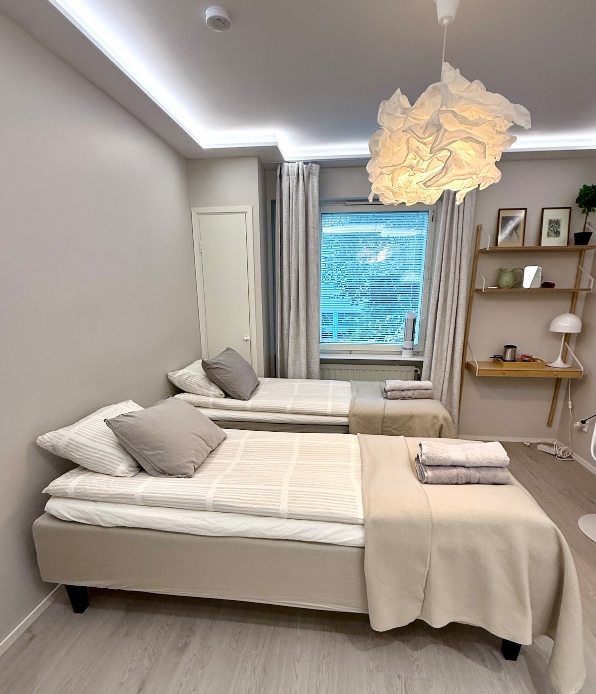 Hakakatu 6:ssa sijaitseva kohde on vastaremontoitu ja viihtyisä tila 1–4 hengelle. Kohteessa on kaksi 90 cm leveää sänkyä, joista voit halutessasi yhdistää extraleveän parisängyn. Vuodesohvassa voit rentoutua vaikka kirjan parissa ja tarvittaessa se muotoutuu myös 120 cm leveäksi sängyksi. Ylelliset puuvillasatiinilakanat takaavat hyvät unet. Keittiö on hyvin varusteltu, kohteessa on myös pyykinpesukone. Jyväskylään on matkaa vain 20km ja lentoasemalle 5km.