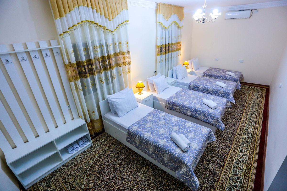 Matatagpuan ang aming guesthouse sa sentro ng Bukhara. Nasa maigsing distansya ang lahat ng makasaysayang lugar. Naghihintay sa iyo ang libreng wi - fi at masarap na almusal. Kung gusto mong makita kung paano ipinagdiriwang ng Uzbek ang Navruz, pumunta lang sa aming guesthouse sa ika -21 ng Marso! Magugustuhan mo ang bahay na ito! Matatagpuan ang guesthouse sa gitna ng sentro ng lungsod, malapit sa Lyabi Hausa. Nagbibigay kami sa mga bisita ng masaganang almusal, libreng Wi - Fi TV, satellite TV, at lahat ng amenidad na kailangan mo.