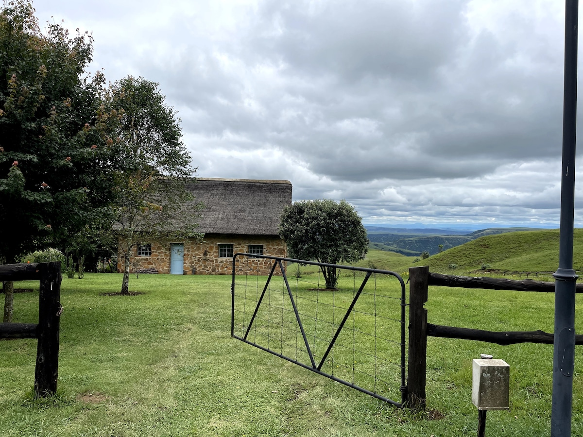 Midway sa pagitan ng Johannesburg at Durban. Itinayo ng orihinal na bato ang cottage sa bundok na may bubong na thatch kung saan matatanaw ang Drankensberg. Mga kahanga - hangang tanawin at klima ng champagne. Matatagpuan ang bahay sa isang Conservancy na nagpoprotekta sa natatanging palahayupan at flora ng African Montane biosome.