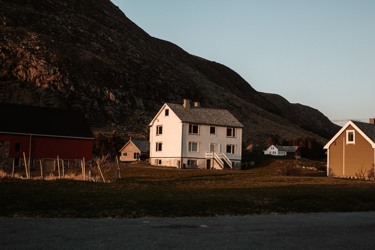 Magandang bakuran. Ang bakuran ay binubuo ng Hovudhus, Eldhus, Stabbur at isang garahe na ginawang apartment. Ang lahat ng gusali ay nasa magandang kondisyon at bagong ayos. Ang lumang bahay-apoy na inihanda para sa mga late na oras ng gabi na may live na apoy sa pugon ay isang karanasan sa sarili nito. Mayroon ding sauna na maaaring i-enjoy. Ang lugar ay hindi nagugulo, at malapit sa dagat. Mayroong pribadong beach na hindi nagagalaw. May mga pagkakataon na makita ang mga hayop sa isang modernong farm na malapit lang.