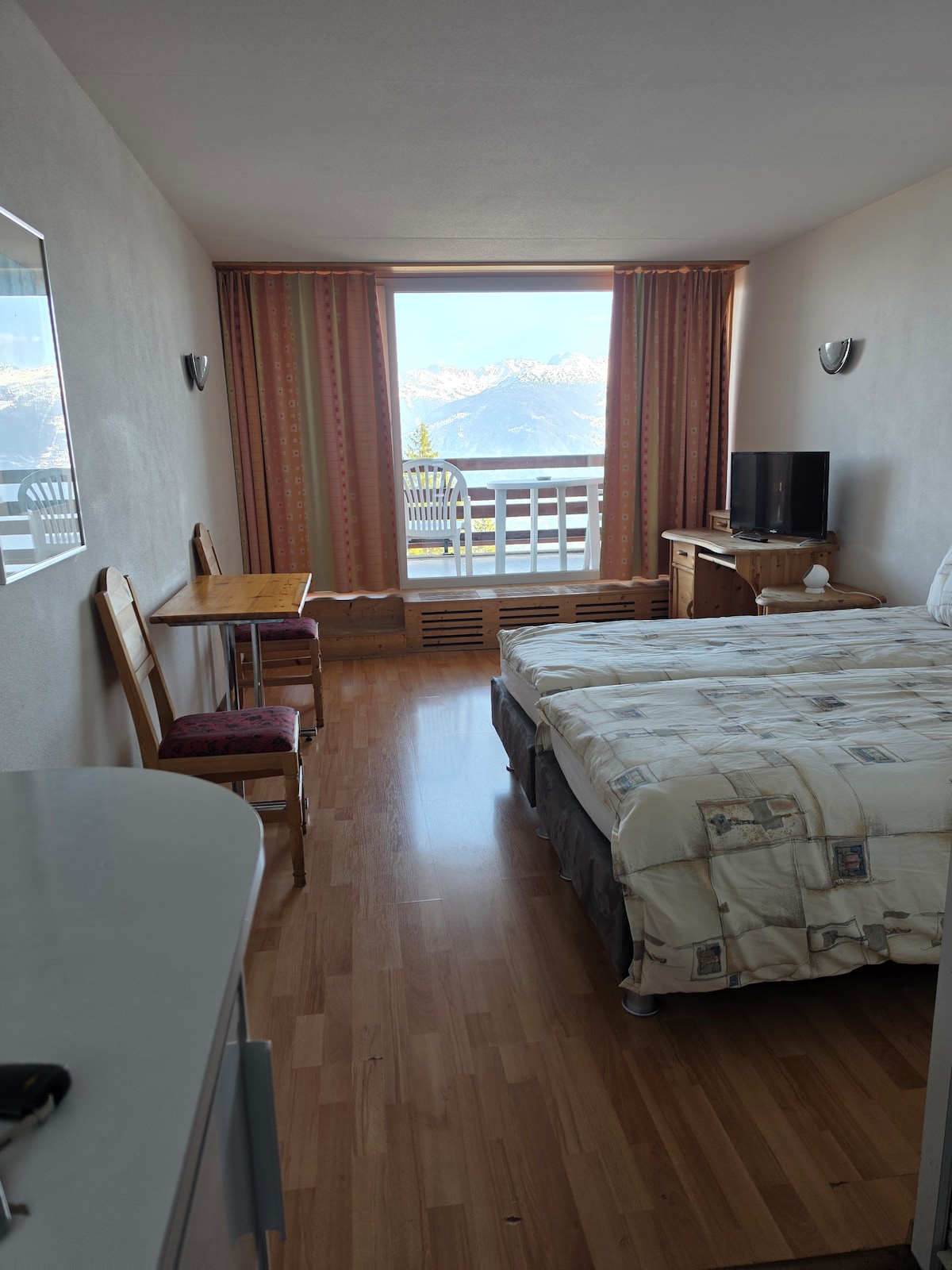 Studio de 27m2 avec terrasse et magnifique vue sur les Alpes Valaisannes. Chambre avec TV, kitchenette, 2 lits simples, 1 salle de bains avec WC et baignoire.