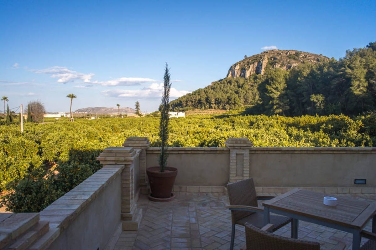 Matatagpuan ang pribado at magandang villa na ito sa kalahating acre plot na may mga malalawak na tanawin ng mga bundok na hindi nasisira, at sa malinaw na araw, makikita mo ang malayong tanawin ng dagat. Gumugol ng mahabang gabi ng tag - init gamit ang isang baso ng lokal na alak na nakaupo sa mataas na terrace ng pool at tangkilikin ang mga nakamamanghang sunset. Ang pagkakaroon ng pagpipilian ng ilang mga lugar ng kainan sa patyo, maaari mong piliing tumingin sa romantikong Italian style manicured garden o sa makulay na mga ilaw ng lungsod ng Valencia.