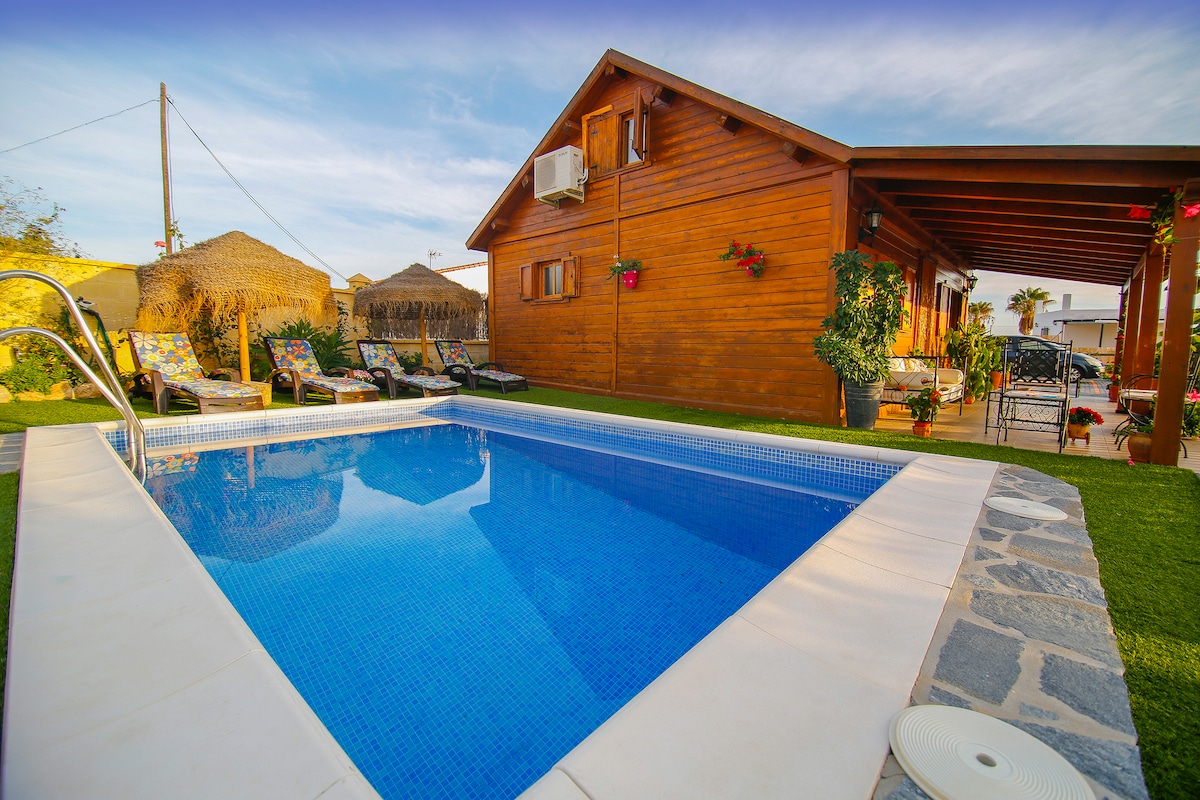 Acogedora casa de madera a 1Km. de la playa, situada en Almayate (Torre del mar) Málaga, Andalucía. Esta casa rural se compone de buhardilla, cocina abierta con barra americana que da al salón comedor. Dormitorio principal y baño. En el exterior hay un acogedor porche cubierto, piscina con jardín y y zona barbacoa. Desde la zona de la barbacoa y el exterior del porche se divisa el mar. Todo totalmente preparado y acondicionado para el descanso, tranquilidad y disfrute de los huéspedes
