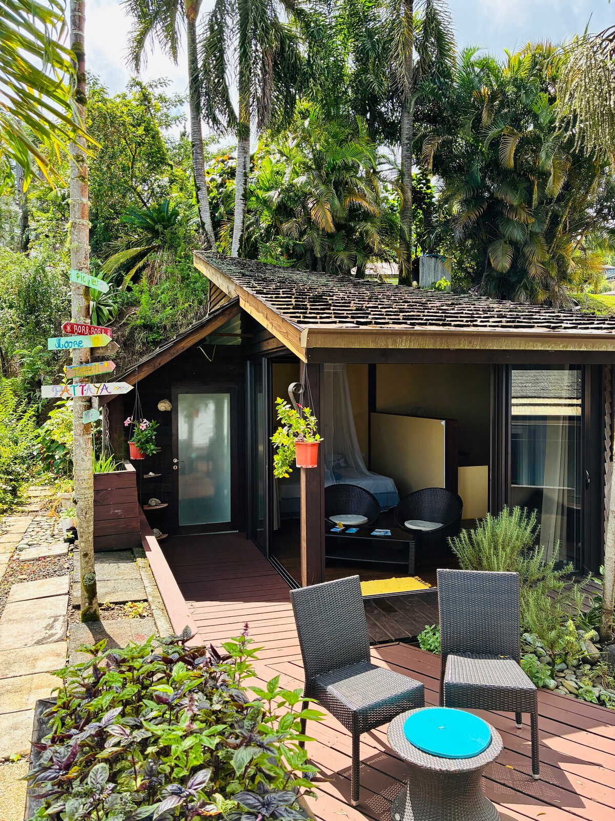 Bungalow de 25 m² (+terrasse couverte de 10 m2 ) indépendant dans grande propriété arborée, calme, lotissement résidentiel, kitchenette équipée, SDB eau chaude, lit double 160x2m qualité supérieure hôtel (matelas orthopédique ),Wifi, TV, ventilateurs, parking, tout équipé, draps, serviettes,savon, shampoing ....grande piscine disponible (en cas d'absence) Belle vue sur océan et l'île de Moorea. Checkout tardif possible. Nous possedons aussi un Bungalow bord de lagon à Moorea (nous contacter)