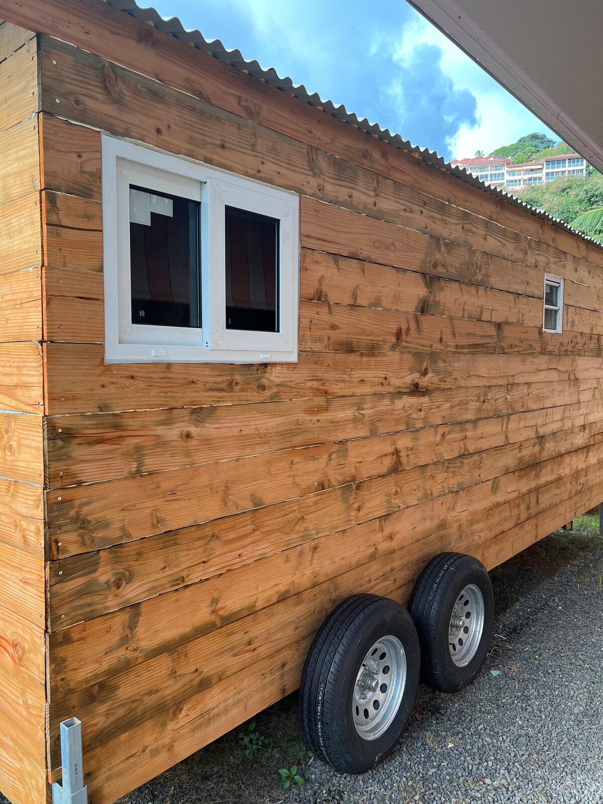Véritable roulotte en Bois aménagée et équipée comme un véritable petit chalet cosy à proximité de la Plage et de commerces Fonctionnelle avec un coin cuisine (réfrigérateur, micro onde,cafetière, bouilloire, plaque chauffante, ustensiles de cuisine), coin nuit avec téléviseur, coin repas intérieur et extérieur et salle d’eau ( vasque, toilette et douche) leTout climatisé dans un petit jardin arboré à proximité de l’habitation des hôtes .