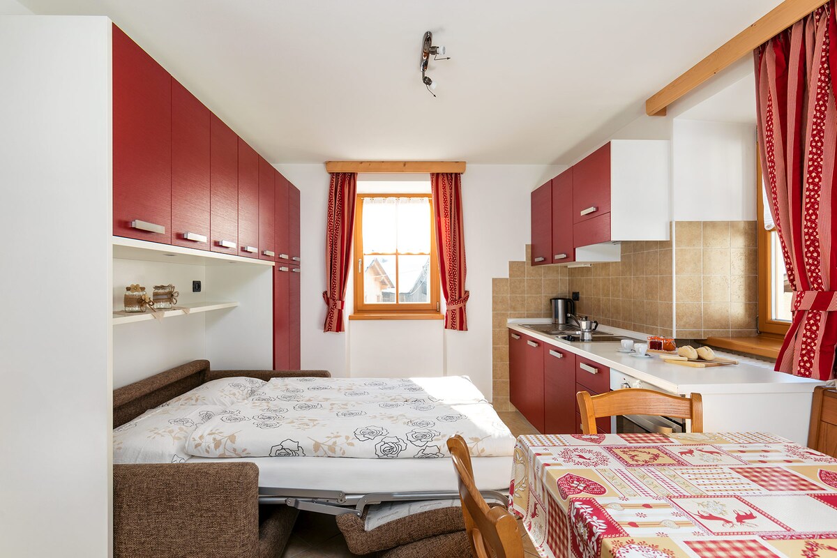May malaking sala at kusinang kumpleto sa kagamitan na may dishwasher at microwave ang apartment. Ang silid - tulugan (na may double bed) ay maaliwalas at maluwag; gayunpaman, kung kailangan mo ng dagdag na pagtulog, ang komportableng sofa bed ay handa na para sa dalawa pang tao sa sala! May satellite TV at telepono ang living space. Maaari mong samantalahin ang aming libreng wifi at libreng skibus sa taglamig