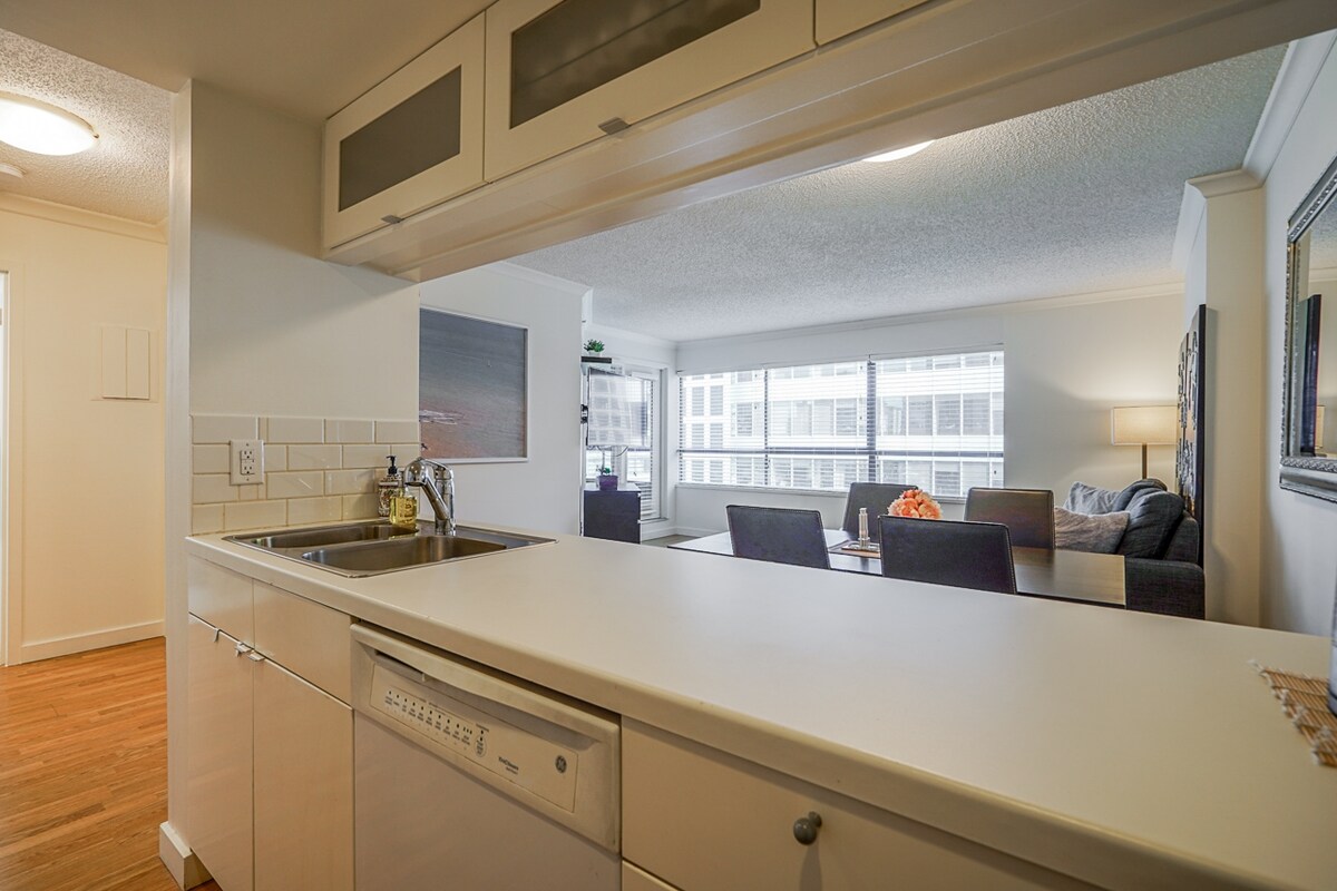 Isang condo sa ika-12 palapag na may isang kuwarto sa downtown Vancouver na may matataas na bintanang nakaharap sa timog, na nag-aalok ng magandang tanawin ng malaking bakuran ng hotel sa tabi, at bahagyang tanawin ng karagatan. Walang garahe sa paradahan ang gusali kaya hindi namin iyon maiaalok, pero dahil nasa sentro ito, madaling mapupuntahan nang naglalakad ang lahat ng uri ng shopping, maraming restawran, mga daanan sa tabing‑dagat, at marami pang iba.