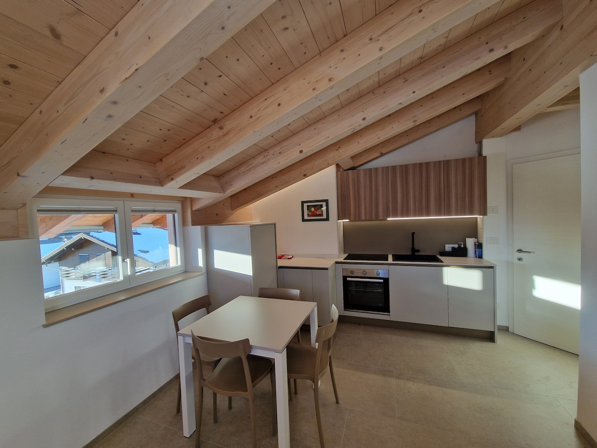 Magandang napakalinaw na attic na binubuo ng malaking sala na nakaharap sa timog na may sofa bed, kusina, dalawang banyo, isa na may bathtub at isa na may shower, dalawang silid - tulugan, isang double at isa na may dalawang single bed (at kahoy na cot para sa mga batang maliliit). Ang lahat ng mga lugar ay nilagyan ng malaking velux. Matatagpuan ang attic sa isang napaka - berdeng lugar, napakatahimik, malayo sa kalsada, malapit sa kakahuyan at wala pang 200 metro mula sa mga ski slope ng Cermis. CIN Code: IT022050C2IXWDFRZB.