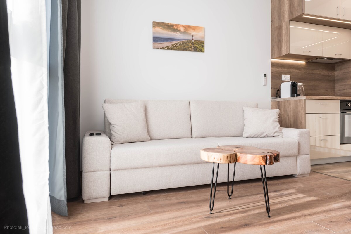 Seaside Escape na may mga nakamamanghang tanawin ng pagsikat ng araw | Pool | SPA at libreng paradahan Mag‑enjoy sa pamamalagi mo sa bagong apartment na ito sa Skyline Apartments. Simulan ang araw mo sa kape ☕️ at nakamamanghang paglubog ng araw sa karagatan mula sa balkonahe. 🌅 🛋️Kumpleto ang kagamitan ng apartment para sa perpektong bakasyon at may modernong kusina at komportableng sala. Nag-aalok ang complex ng seasonal pool 🏊🏼 (Mayo–Setyembre), SPA - sauna, jacuzzi at steam bath 🧖🏻♀️ at magandang hardin🌷⛲️