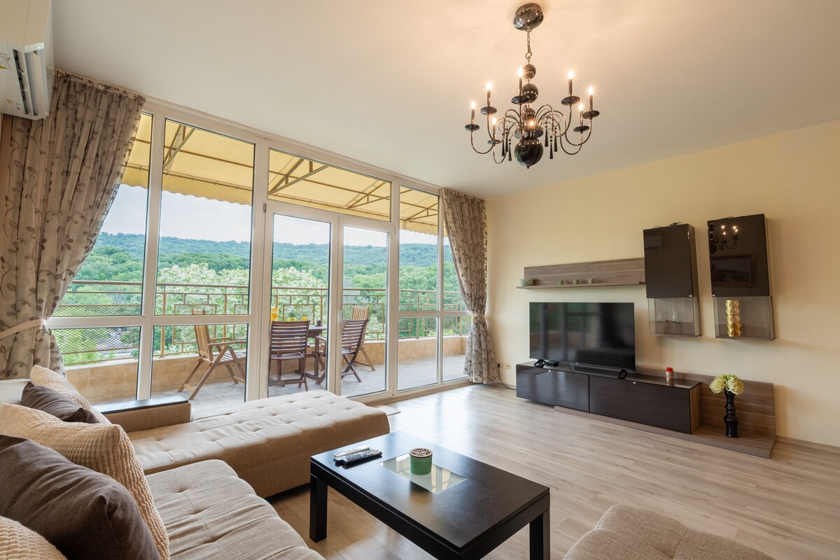 Nag - aalok ang apartment na ito sa Golden Sands resort ng tahimik na pamamalagi sa tahimik na lugar na naiiba sa karamihan ng resort. Magandang tanawin ng kagubatan na walang ingay mula sa mga bar at club. Ang lugar ay may 24/7 na reception, restaurant, pool area at parking zone. Nasa ikalimang palapag ito at may elevator ito. Kapag gusto mo pa ring pumunta sa beach, 10 minutong lakad lang ito at nasa sentro ka ng Golden Sands.