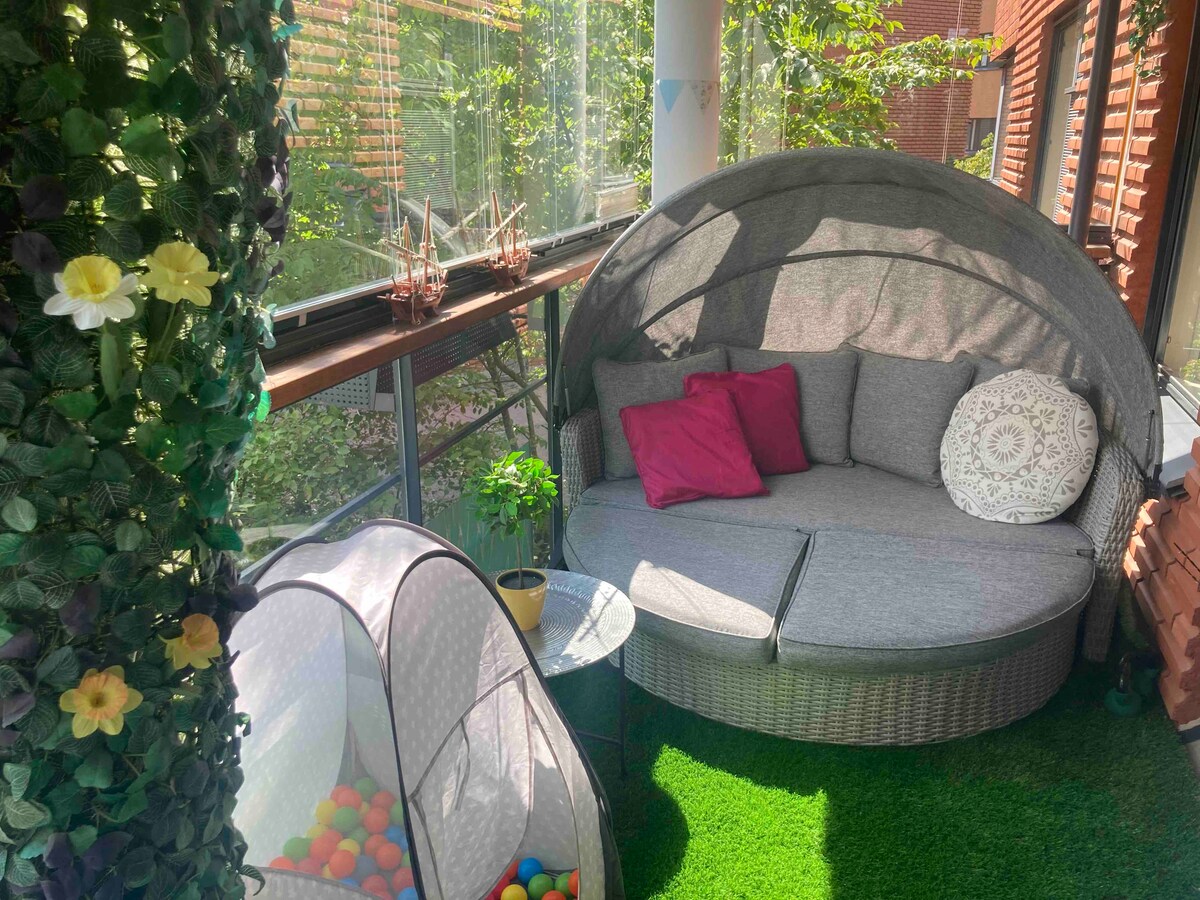 This peaceful and quiet top floor studio features a hip boho interior, an enormous glazed balcony, and lush green surroundings by the sea. The apartment is a hidden little gem lovingly decorated with a mix of design classics and everyday objects. 100 MB WiFi, well-equipped kitchen, washing machine and a practical walk-in closet add comfort also for longer stays. The place is professionally cleaned before every guest and the self-check in allows a flexible arrival schedule.