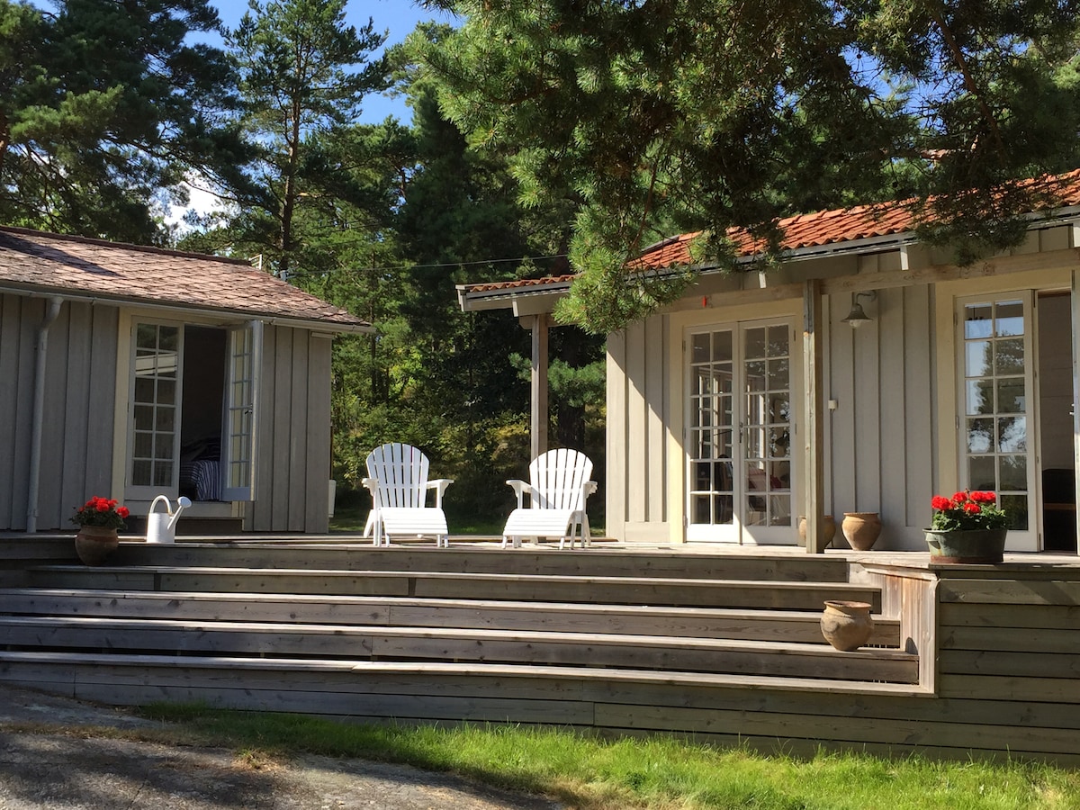 Nybyggd stuga på 30 kvm. 5 minuters promenad från hamnen. - Öppen planlösning med kök och vardagsrum i ett. - Sovloft med 2 enkelsängar. - Vardagsrummet har en Bäddsoffa. - Köket har induktionshäll och ugn. - Helkaklat badrum med toalett, dusch och tvättmaskin. - Stor altan runt huset med matplats. - Utsikten består av tall och blåbärsskog - Städning ingår ej. - Husdjur ej tillåtet - Gäster har med sig egna sängkläder och handdukar (kan hyras för 150 kr per person)