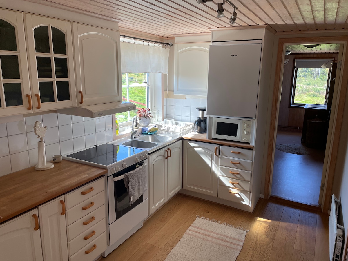 Welcome to our elegant and peaceful home just 10 minutes from Växjö. This cozy two-story house is perfect for couples, families, or friends. It features two bedrooms on separate floors for added privacy. The first-floor bedroom has a queen-size bed, comfortable bedding, and a desk. The ground-floor bedroom offers a queen-size bed and a dresser for storage. Please note that the terrace balcony is not included in the listing.
