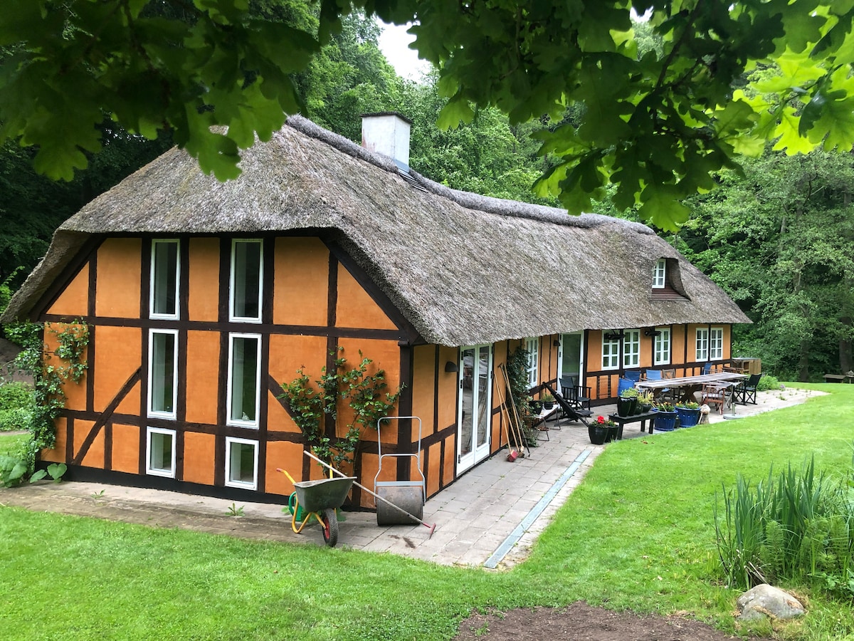 Du falder i søvn til bækkens rislen - den løber langs huset, 4 m. derfra Om natten kan du høre uglerne tude, og når du om morgenen går gennem køkkendøren ud på terrassen, ser du sommerfugle, guldsmede og måske rådyrene i skoven Her er helt, helt stille. Man tilbringer mange timer på den 100 m2 terrasse med udgang fra 4 steder i huset, langbord og terrassevarmer. 25 minutters gåtur gennem skov og eng til Rosenvold strand. 5 min. kørsel til købmanden. 25 min. til Vejle og 1 time til Legoland.