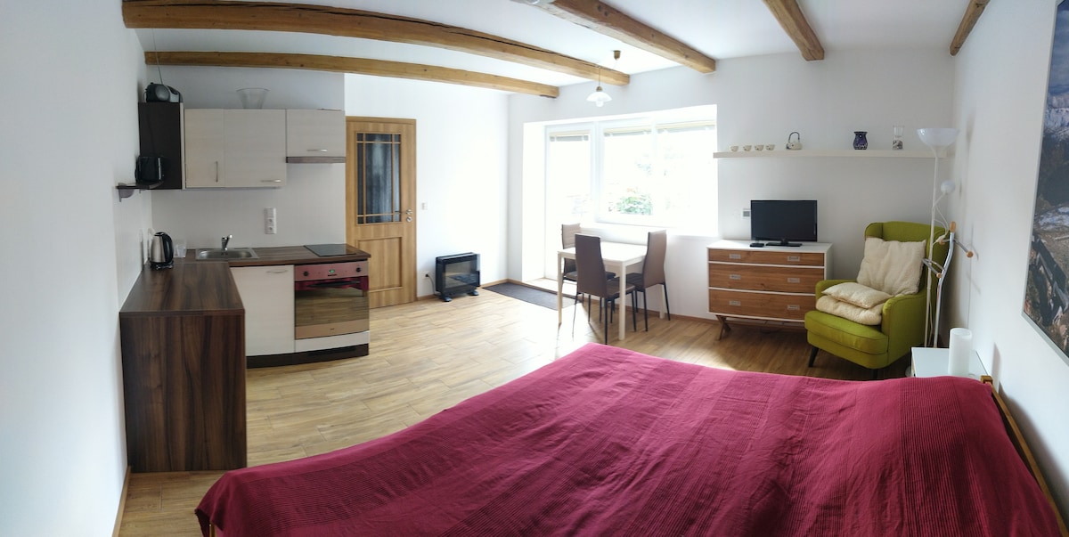 Bagong ayos, kumpletong kagamitan na apartment 1 + KK na may terrace, nakaharap sa bakuran ay matatagpuan sa ika-1 palapag ng bahay. Naa-access ito sa pamamagitan ng hagdan (walang elevator). Kahit na ang bahay ay nasa plaza, tahimik at tahimik ang apartment. Sa loob ng 5 minutong lakad, makikita mo ang kastilyo ng Slavkov na may magandang parke, mga restawran, pastry shop, cafe, wine shop, tindahan, atbp. Mayroon ding golf course, swimming pool at iba pang sports facility sa malapit.