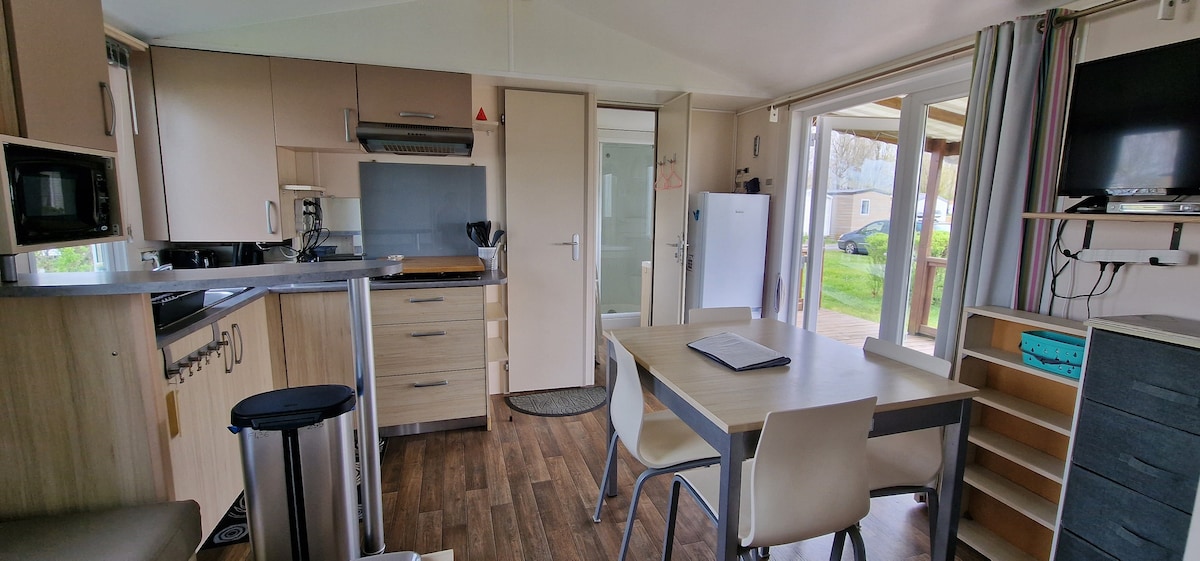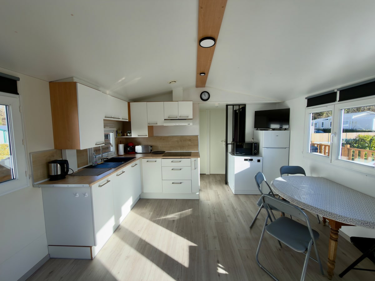 3 - star na mobile home para sa tahimik na pamamalagi kabilang ang: Sala na bukas sa kusina Double bed sa silid - tulugan 140X190 Kuwarto 1 single bed at 1 bunk bed 80X190 Mga kumot at unan Hindi nakasaad ang mga linen at paliguan. Matutuluyan ayon sa campsite kapag hiniling Shower bathroom, lababo Magkahiwalay na Toilet Semi - covered terrace, mesa at upuan Bintana sa bawat kuwarto Clim/Chauf - Reversible Air Conditioning Madaling ma - access ang 5G Paradahan ang sasakyan sa harap ng mobile home