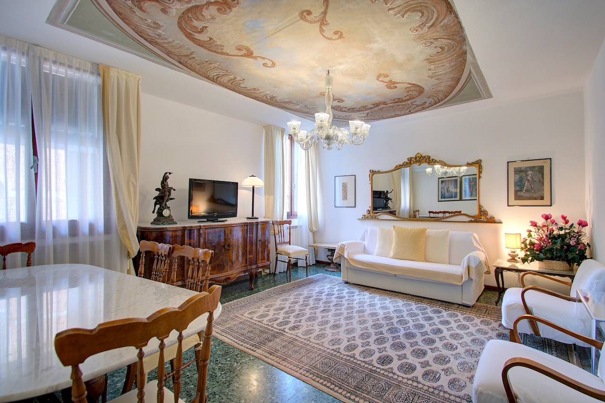 Isang buong apartment na may Venetian style na dekorasyon, sa isang pribadong palazzo mula sa 1600's, na may NAKAMAMANGHANG TANAWIN. Nakatayo sa unang palapag, ang apartment ay may isang malaking silid - tulugan na may queen - sized na kama. Ang banyo ay maluwang at nilagyan ng malaking shower. Ang kusina ay may fridge, toaster, takure at Nespresso machine. Ang pasukan ay nagbubukas sa isang napakalaking living area na may tanawin ng kanal kung saan maaari kang umupo at karaniwang hawakan ang tubig habang nag - e - enjoy ka ng isang baso ng alak.
