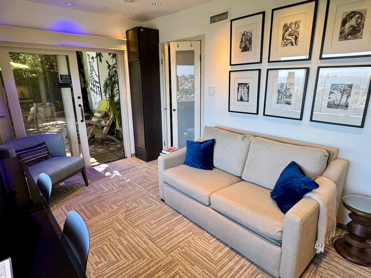 See our new VIDEO TOUR on splash page of the STUDIO 1080 HOLLYWOOD website. OUR REVIEWS SAY IT ALL!Hollywood Hills getaway w/ BREATHTAKING VIEWS @ 1080 feet above sea level. You'll love Sonos sound & automated shades. Enjoy new Espresso Bar & hanging wardrobe. This high-end studio offers premium amenities, with espresso machine, microwave, Sub-Zero fridge, dedicated HVAC, & 55" 4K Smart TV. Alexa controlled lights/music/blackout shades. UPDATED 2024 LADBS code compliance License # HSR24-002592