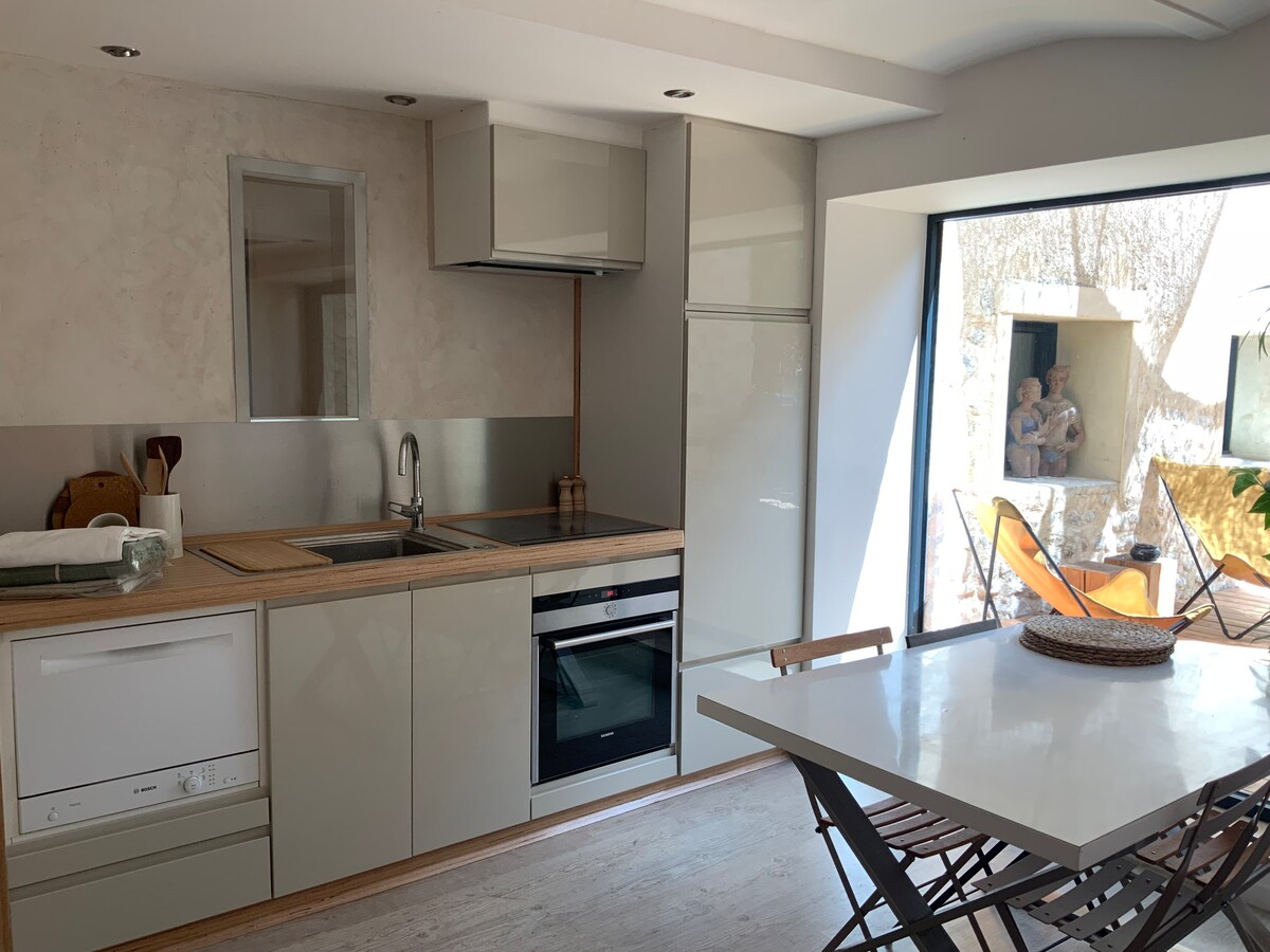 I - privatize ang buong bahay na ito; naisip bilang pahinga mula sa oras, pinaghahalo nito ang pagiging tunay at modernong kaginhawaan Isang intimate na kapaligiran, isang pribadong wellness area: isang tunay na cocoon para makapagpahinga; na may sauna at bathtub. Para sa isang espesyal na okasyon o maglaan lang ng oras para magkita, ang bawat detalye ay naisip na magbigay ng isang natatangi, banayad at nakakarelaks na karanasan. Dito, iniimbitahan ka ng lahat na idiskonekta, sa kasiyahan ng pagtikim sa kasalukuyang sandali.