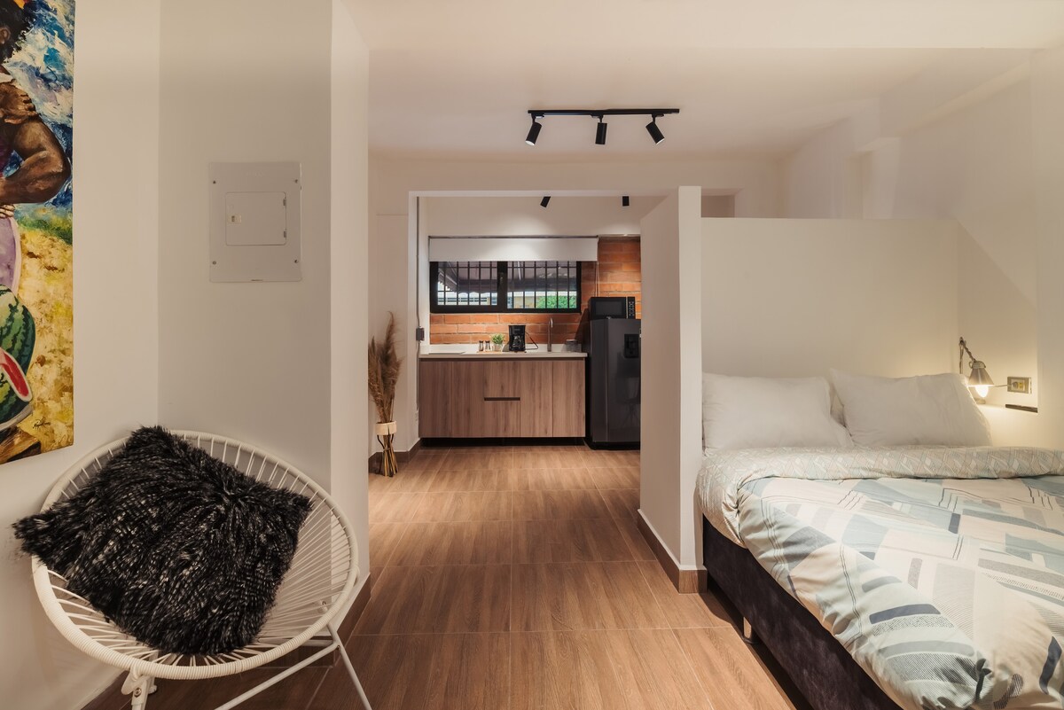 • Ultra High speed 400 Mb WiFi, Fiber Optic • Right in Laureles Heart, the best neighborhood of the city. Walking distance to best restaurants, supermarkets, cafes, parks. All delivery apps work 24/7. • Extremely safe neighborhood • Air Conditioning • Transparent prices: No cleaning or service fee • Fully equipped kitchen • Contactless self check-in with access code • Smart TV with Netflix • Strictly cleaned+sanitized • NOTES: Small, cozy studio. It used to be a garage. Low ceiling in the toilet