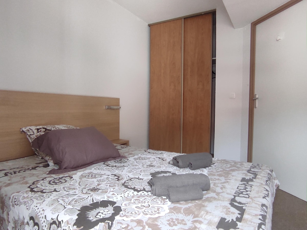 Masiyahan sa tahimik na lugar na ito, malapit sa sentro ng lungsod at sa mga thermal bath. Matatagpuan sa paanan ng Canigou at hindi kalayuan sa mga thermal bath na may mainit na tubig na may sulfur para makapagpahinga, perpekto para sa pagha-hike, pagka-canyon, at pagski depende sa panahon (45 minuto sakay ng kotse). Isang double bed, isang sofa bed. Masisiyahan ka sa swimming pool ng tirahan (tag - init). May mga linen (mga sapin, tuwalya).
