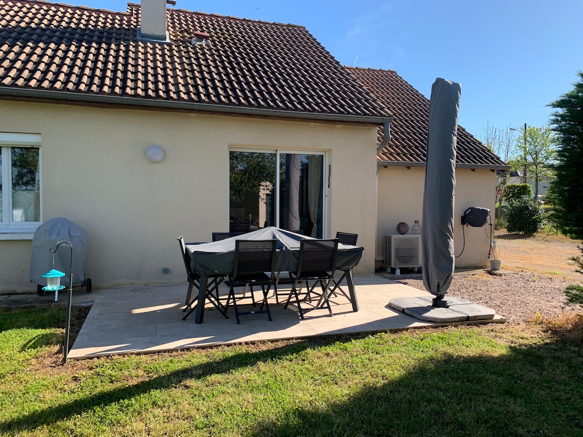 Kaakit - akit na tahimik na bahay sa taas ng Sainte - Sévère - sur - Indre. Posibilidad na tumanggap ng 4 na tao salamat sa isang hiwalay na silid - tulugan na may double bed at sofa bed sa sala. Mayroon ding malaking terrace at hardin ang bahay, kung saan puwede kang mag - enjoy sa outdoor lounge, sunbed, at barbecue. Ang lahat ng mga pangunahing amenidad (mga sapin, tuwalya, shower gel/shampoo...) ay ibinibigay sa rental.