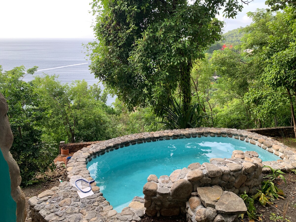 Mahiwagang open air Lodge para sa mga mag - asawa at mahilig sa kalikasan, na malayo sa mga abalang hotel. Plunge pool at sun deck na may mga tanawin sa ibabaw ng Pitons at Caribbean Sea. Studio - style accommodation na may kusina, sitting area, queen sized bed at pribadong panlabas na banyo. Kasama ang homemade continental breakfast. Mga malalawak na tanawin, sustainable luxury, concierge, magiliw na tumutugon na kawani, housekeeping, paradahan. Mga karagdagang serbisyo: pribadong kainan, spa treatment, pribadong driver. 10 minuto sa Soufriere, mga beach, mga aktibidad.