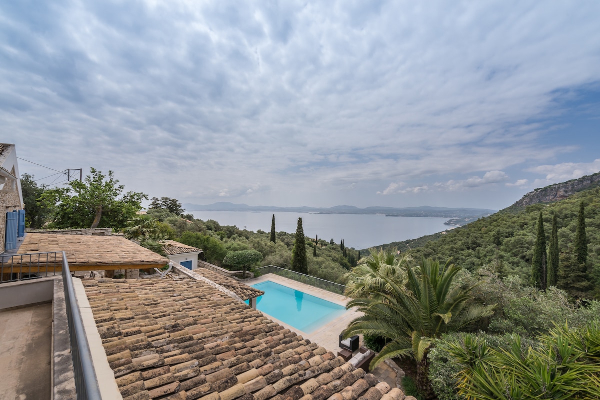 May perpektong kinalalagyan sa tuktok ng isang bundok sa gitnang tradisyonal na Greek village Evropouloi, 10 minuto lamang sa pamamagitan ng kotse mula sa parehong Corfu Town at Corfu Airport at 20min mula sa pinakasikat na mga beach , ang nakamamanghang bagong ayos na bahay na bato na ito ay ang perpektong lugar para sa iyong mga pista opisyal sa Greece. Ang mga nakamamanghang tanawin sa buong Ionian channel sa Greek mainland sa kabila.