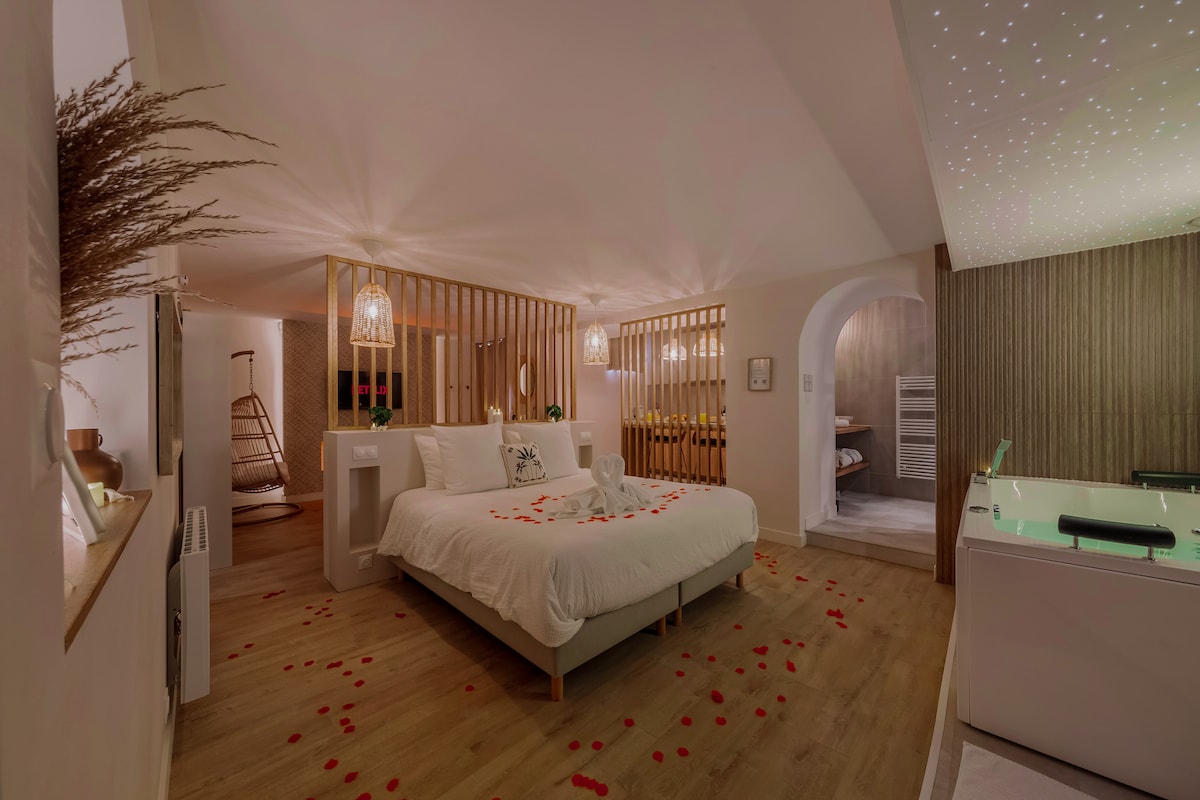Ang BANJAR Suite, 20 minuto mula sa makasaysayang sentro ng Rennes, isang romantikong cocoon na inspirasyon ng 66m² Bali, na idinisenyo para sa hindi malilimutang bakasyon para sa dalawa. Magrelaks gamit ang premium na balneotherapy, dobleng shower. May lihim na pinto na nagpapakita ng pribadong spa na may sauna at massage table. Masiyahan sa king - size na higaan, tantra chair, steam fireplace, starry sky. Sa gitna, malapit sa mga tindahan, mamuhay ng marangya at matalik na karanasan na pinagsasama ang relaxation at pagtakas.