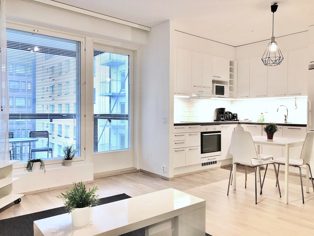 Magandang lokasyon sa gitna ng Tampere! 50 metro lamang mula sa pangunahing pasukan ng bagong Nokia Arena, 100 metro mula sa istasyon ng tren at bus. Ilang hakbang lang ang layo ng lahat ng serbisyo at atraksyon, lahat ng restawran, cafe, night club, shopping center, at boutique. Ang apartment ay bago, ang bahay ay itinayo sa 2022. Sa apartment ay king size bed, sofa bed para sa dalawang tao, maluwag na banyo, maganda at compact kitchen area. Mesa para sa kainan at pati na rin sa lugar para sa pagtatrabaho sa laptop.