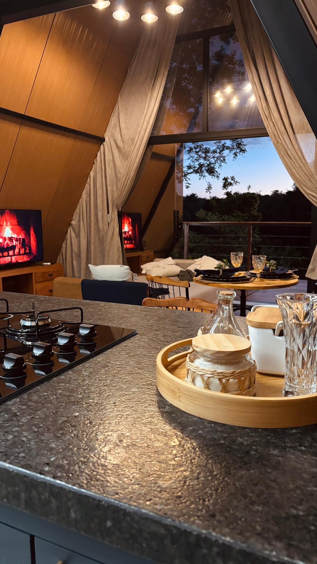 @yachales- Casa dos Ventos Ang A - frame cabin, 19km mula sa Piri, ay maaaring tumanggap ng hanggang 4 na tao na may kaginhawaan at privacy. Ibabang palapag - May double bedroom na may air conditioning at smart TV, komportableng sala, at kusinang kumpleto ang kagamitan. Malaking deck na may hot tub. Sa itaas na palapag - Nag - aalok ang maluwang na silid - tulugan na may air conditioning ng mga tahimik na gabi at nakamamanghang tanawin ng Chapada de Pirenópolis. Ang fire pit area, na may campfire at swings, ay perpekto para sa mga sandali sa paglilibang sa ilalim ng mabituin na kalangitan.