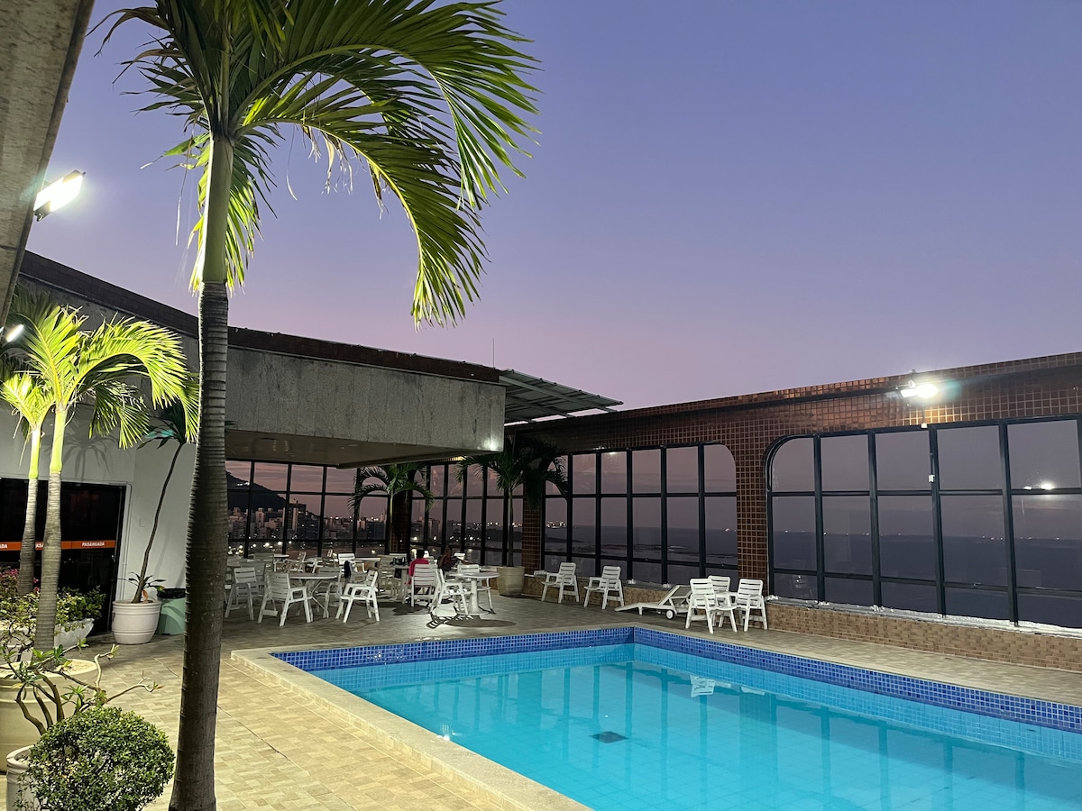 Takpan ng Jacuzzi at tanawin ng dagat gamit ang sunroof. Napakalawak (65m2). Pinakamahusay na Punto ng Costa Beach, ang pinakamagandang beach sa Vila Velha! Kumpletong kusina na may iba 't ibang kagamitan para sa bar, coffintery at pinong mangkok. Naka - air condition na suite, komportable at komportable. Lamang ang pinakamahusay na karanasan sa pagho - host sa Vila Velha! Magiging perpekto ang iyong pamamalagi rito! VENCEM lang !!!