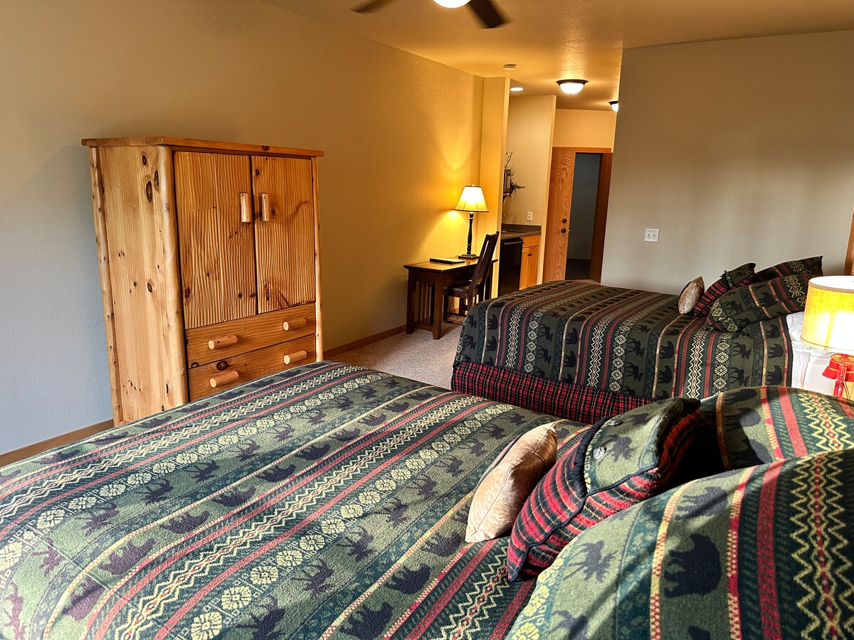 Cozy 442 sq ft studio room with private bathroom and two queen beds, offering stunning lake views. Enjoy the convenience of a mini-fridge, microwave, and satellite TV. Perfect for a family getaway, with amenities like ceiling fans, A/C, and Wi-Fi to make your stay comfortable. Surrounded by the beauty of the Northwoods, our lodging options provide a home away from home experience.
