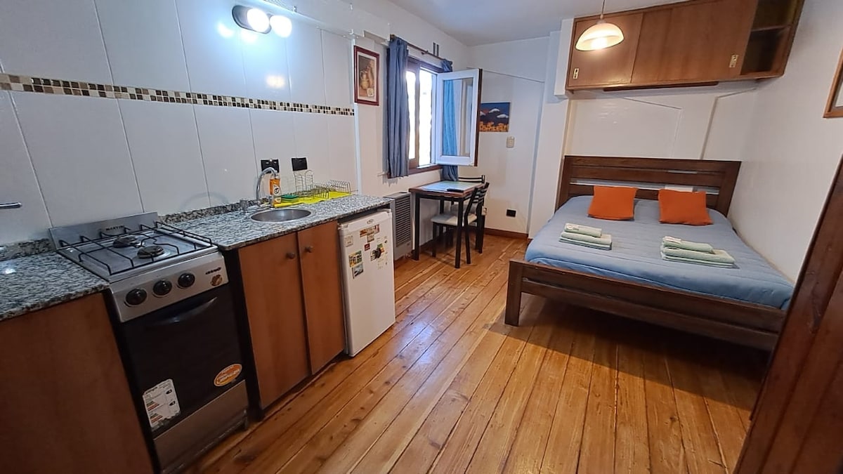 Kahusayan appartment, napaka - sentro (250 metro mula sa Civic Center), sa gusali sa harap lamang ng Lake Nahuel Huapi (nang walang pagtingin). Praktikal na single room na may komportableng 2 - seater sump at sofa bed. Smart TV na may Netflix, wifi at kitchenette na may microwave, toaster, turkey at electric anafe. Nasa ikalawang palapag ito ayon sa hagdan.