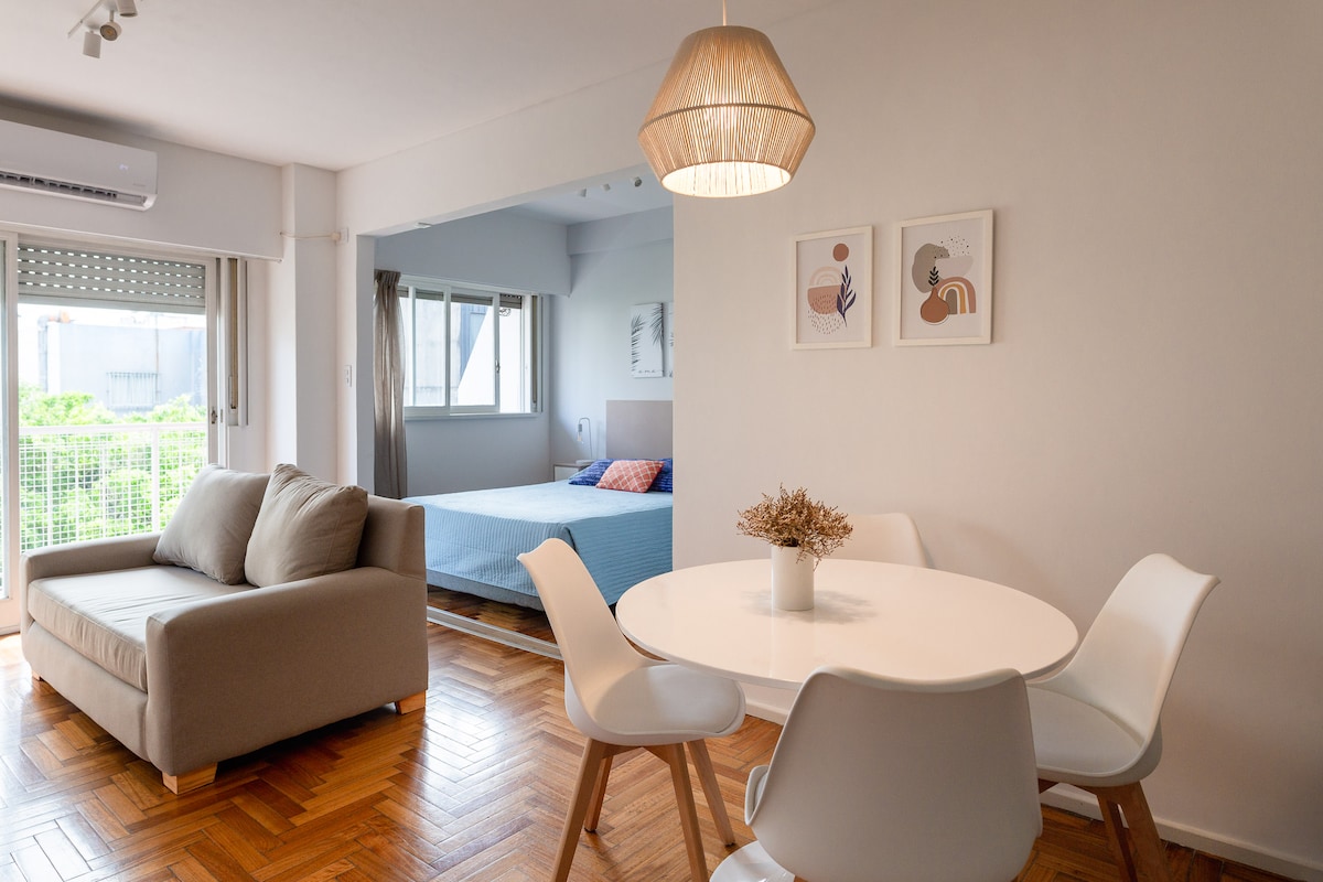 Masiyahan sa pagiging simple ng tahimik at sentrong tuluyan na ito. Studio sa gitna ng Villa Crespo, 400 metro mula sa Movistar Arena (International level event stadium), 300 metro ang layo para sa metrobus subway transport at tren na konektado sa buong lungsod. Napakaliwanag at may lahat ng kaginhawaan para sa perpektong pamamalagi. Kumportableng bagong studio na may pinagsamang kusina, upuan, placard, at buong banyo. Labahan, ihawan, at shared terrace.