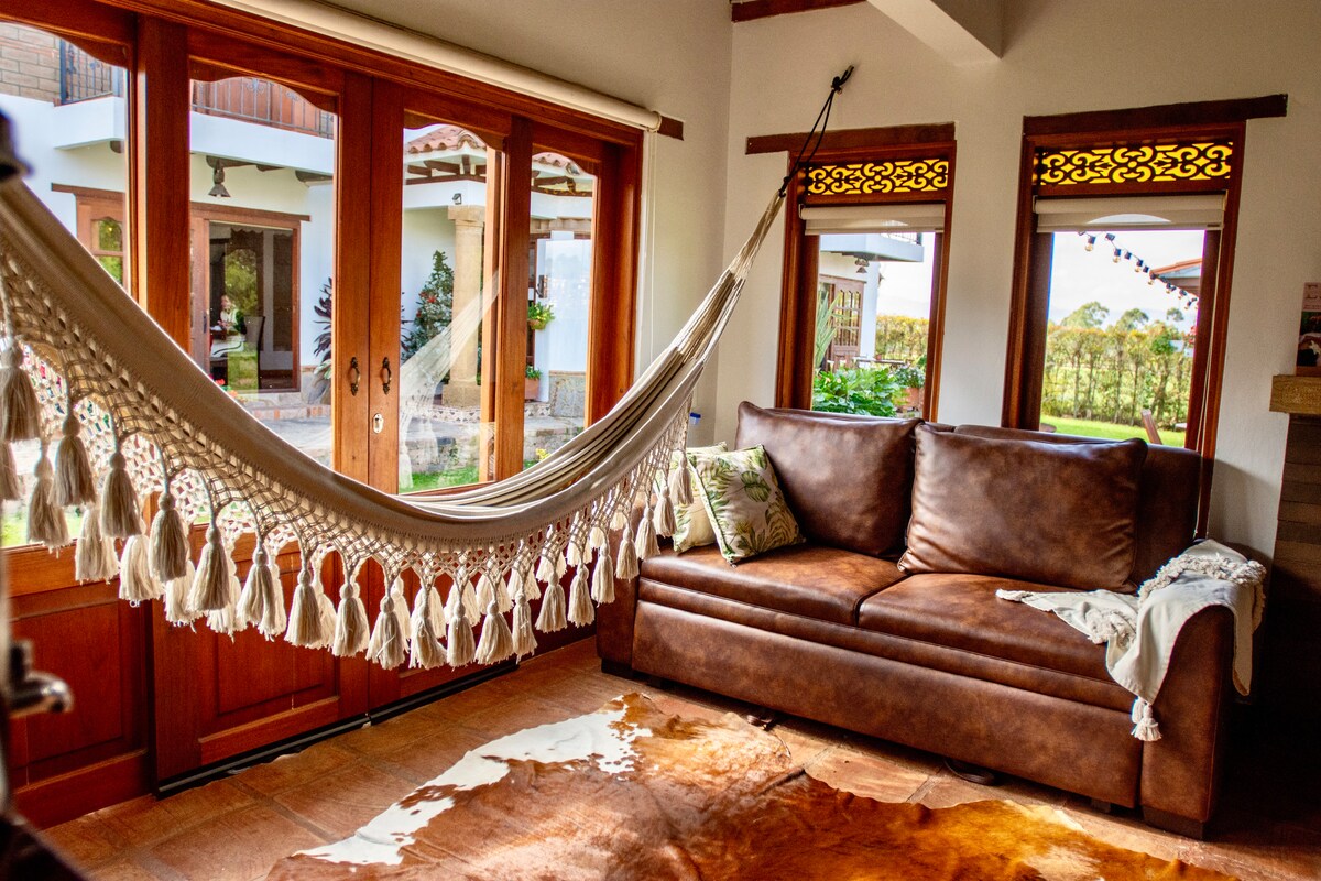 Sa Zuetana, makakakita ka ng napakaaliwalas na kapaligiran, na may 2 silid - tulugan, banyo, kusina, silid - kainan at kuwartong may magandang tanawin at fireplace. Ang cabin na matatagpuan sa bangketa ng El Roble, ay 3 km mula sa Main Plaza ng Villa de Leyva at 1.5 km lamang mula sa Fire Station, 7 minuto lamang sa pamamagitan ng kotse. Matatagpuan ang cabin sa loob ng isang set na nagpapahintulot na ihiwalay ito sa mga pangunahing kalsada sa lugar, na nagbibigay ng katahimikan sa pamamalagi. Paradahan. Pambansang Pagpaparehistro ng Turismo: 74122