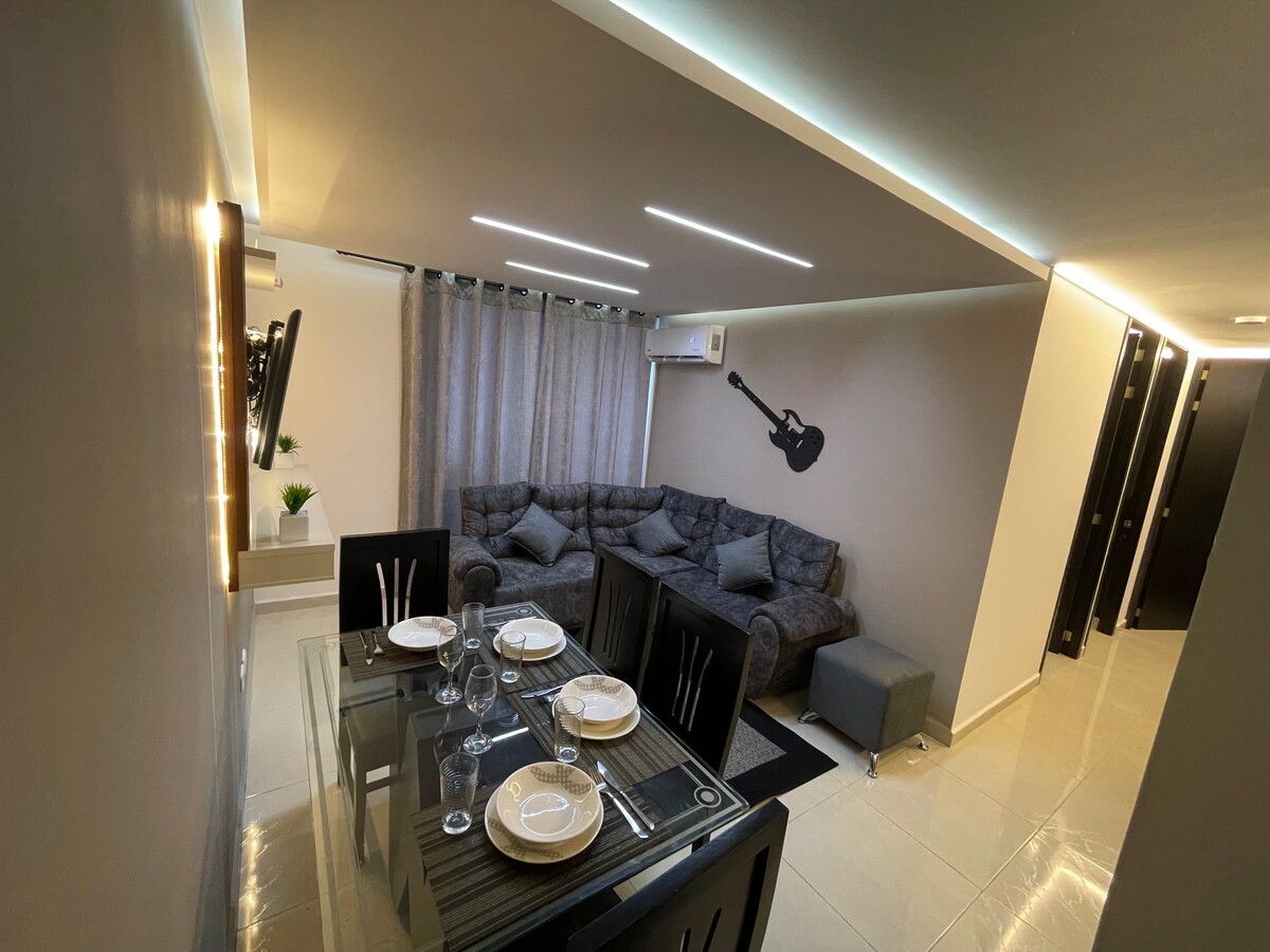 Mag - enjoy sa naka - istilong karanasan sa gitnang tuluyan na ito. Magandang apartment na may mga amenidad na kasama at swimming pool, gym. 24h na serbisyo ng doorman. Zona Segura Libre at sakop na paradahan. Serbisyo sa pagmamatyag sa video. Kaginhawaan at kalinisan. Malapit sa mga restawran, sobrang pamilihan, club, parke, sinehan.